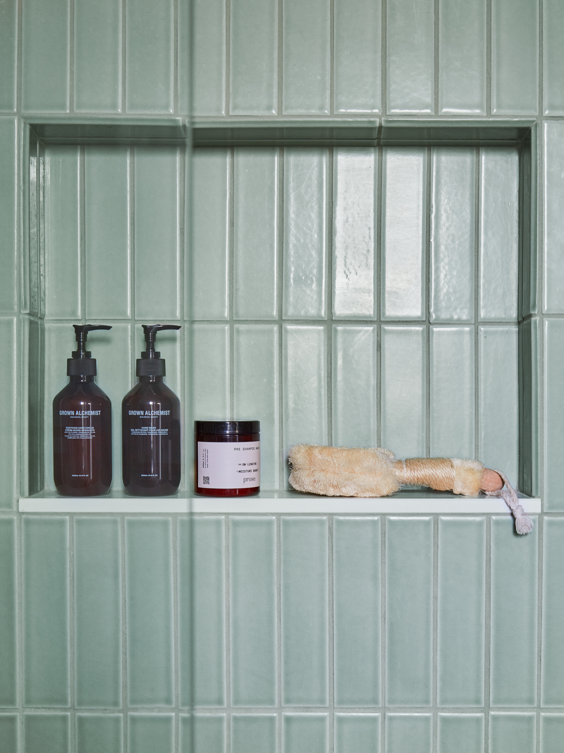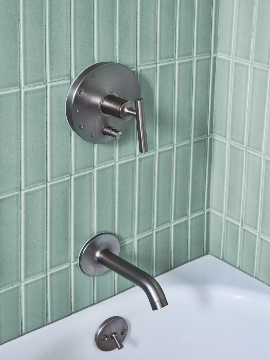 When choosing the new tile for the shower, I was led by scale of the bathroom itself and the size of the floor tile. Fireclay sent us a few samples that I fiddled around with. I wanted to create a sense of airiness, so I became very keen on stacking them vertically. The guy who did the install said it would be simple enough for him to add a niche for our bath products, which was good news, because I hate clutter around the edges of a tub with a passion. We clad the base of our windowsill in the tiles we had left over from the project, so as to not let anything go to waste.