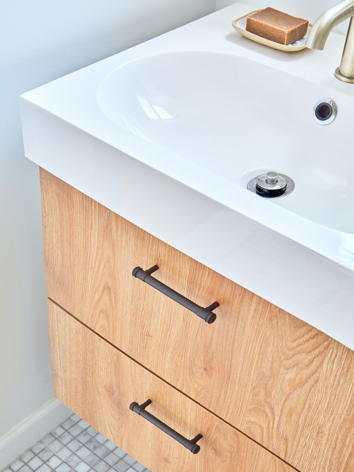 The old gray vanity cabinet wasn’t optimized inside (it was essentially a gaping hole). We swapped it out for a floating IKEA version with upgraded Semihandmade fronts, a Kohler faucet, and Rejuvenation hardware. This piece has two drawers, so my husband and I can keep our things separated. I was so thrilled that I found takers for our old vanity and hardware on my local Buy Nothing Group. Not wasting those items and knowing they’re getting used by someone else is such a relief.