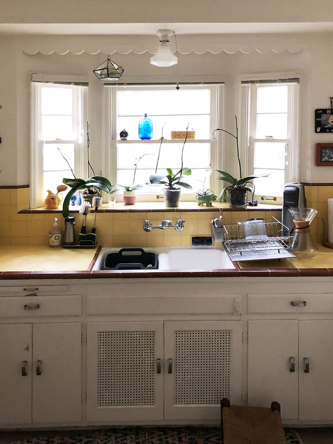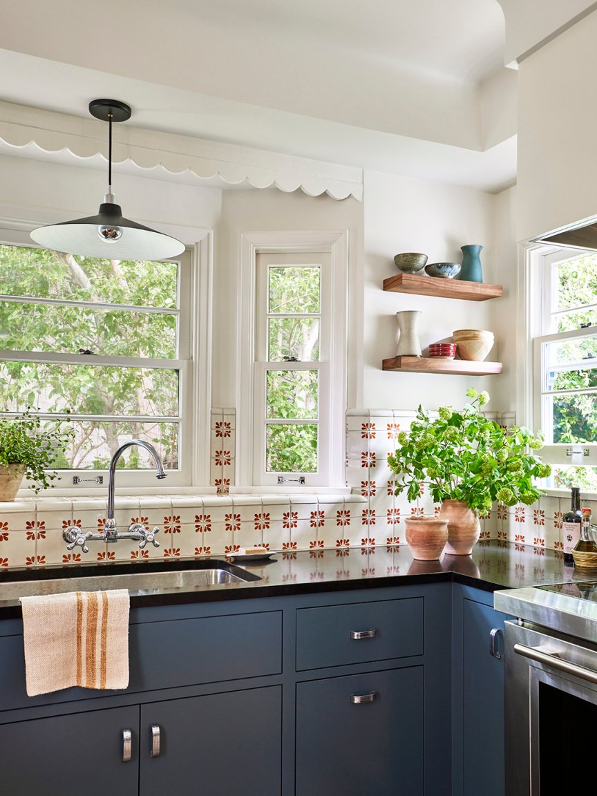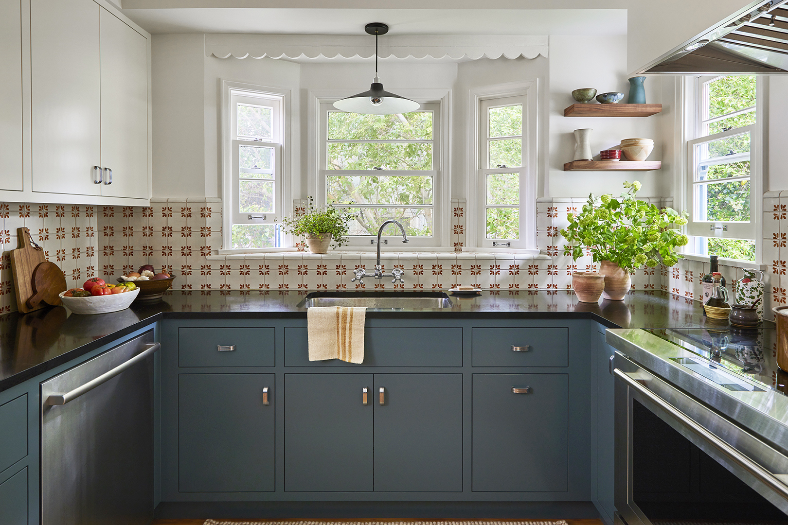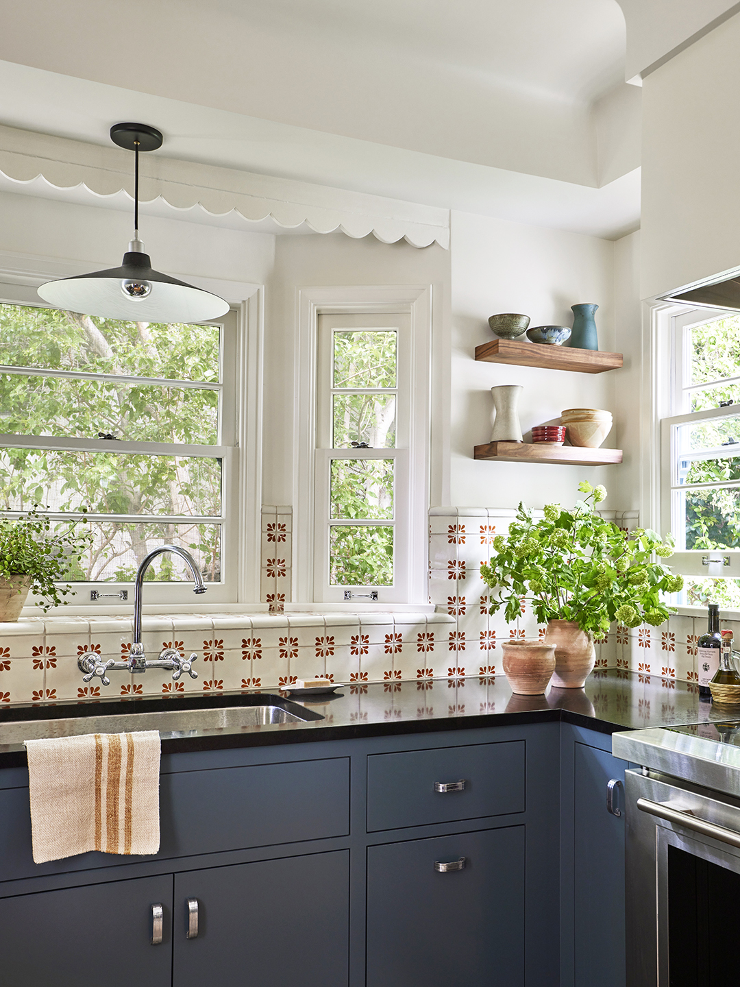 Dunbar and the couple worked alongside Casa Bonita Builders to do minimal construction that would preserve the past but bring in the present. They kept the bay window above the sink and agreed to place new tile in an existing format, which covers the ledge at the base of the panes and sprouts up between them. “The original faucet was not as functional for washing or filling pots, and we all loved the idea of having a wall-mounted one to complement the backsplash,” Dunbar says.