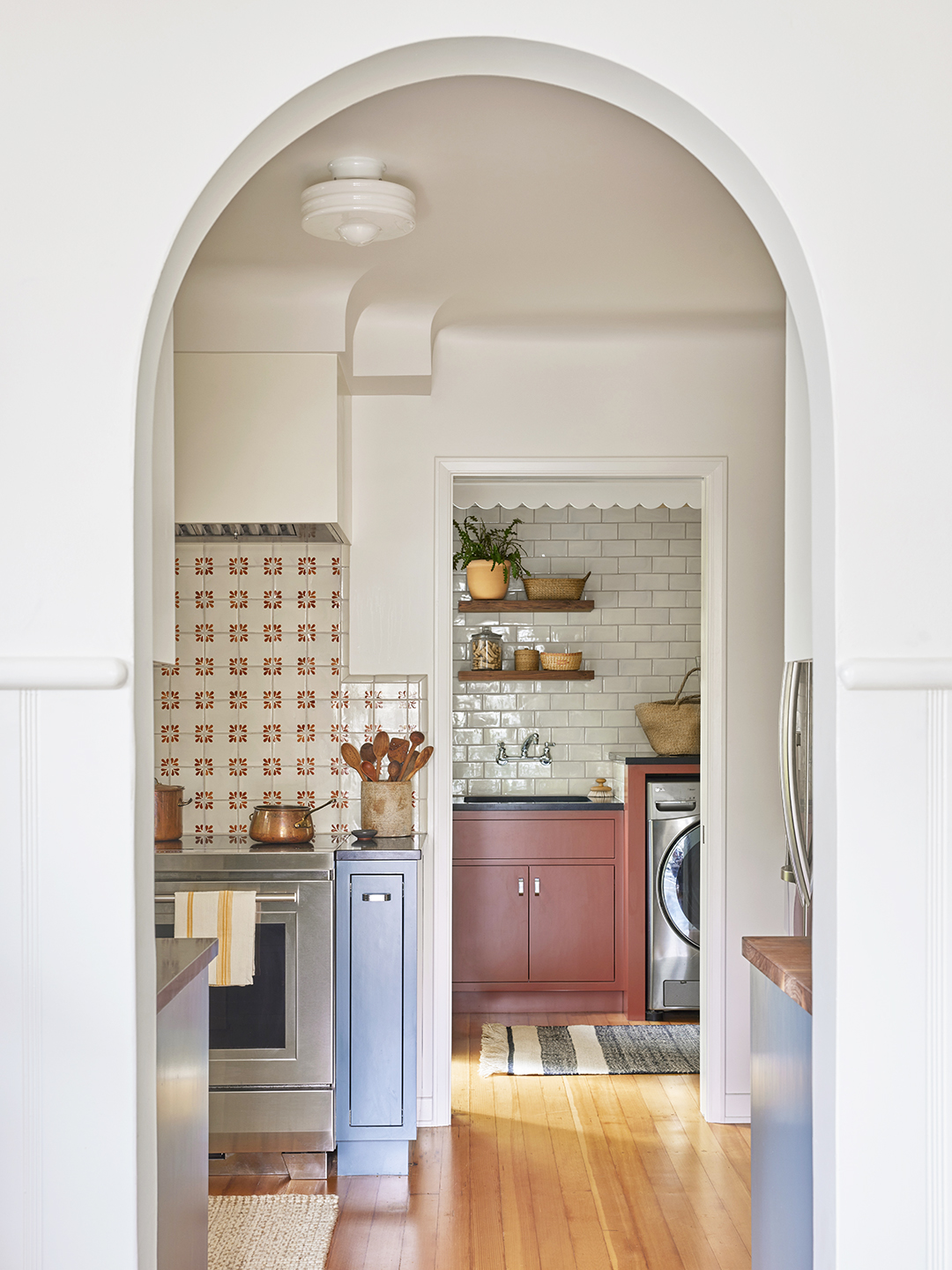 “The rest of the color scheme was based off of the terracotta red in the backsplash,” Dunbar says. “We painted the base cabinets in Dunn-Edwards‘s Iron Creek to help ground the room and provide a pretty contrast to the tile. And by painting the upper cabinets in Diamond, also from Dunn-Edwards, we kept the room from feeling too crowded.” Finally, the mudroom’s cabinets were swathed in the paint brand’s Prairie Clay to bring the kitchen’s earthy red to that area, uniting it all in a timeless palette.