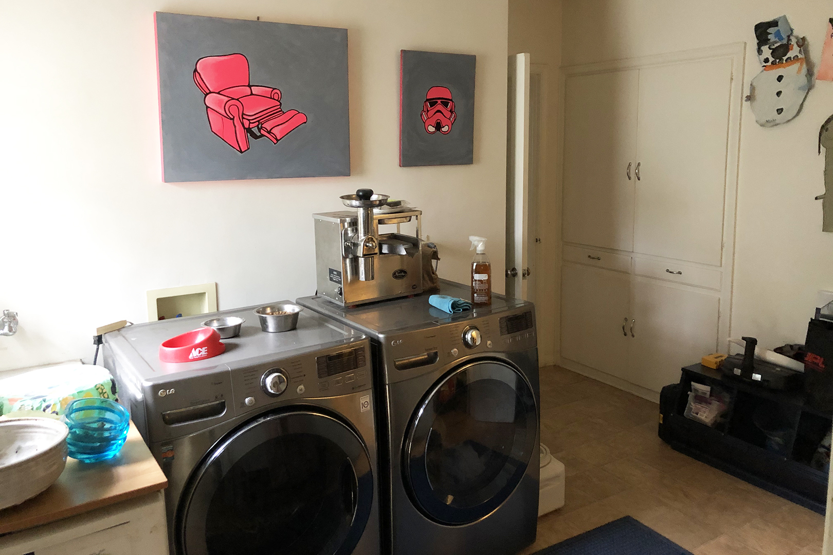 “We originally toyed with the idea of enclosing the laundry behind cabinetry, but the additional cost to conceal everything didn’t make sense with the functionality of the mudroom,” Dunbar says. “By creating this soffit over the laundry counter, we could install a drying rack that could be tucked away when it wasn’t in use.”