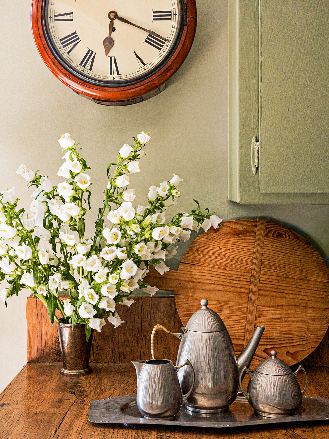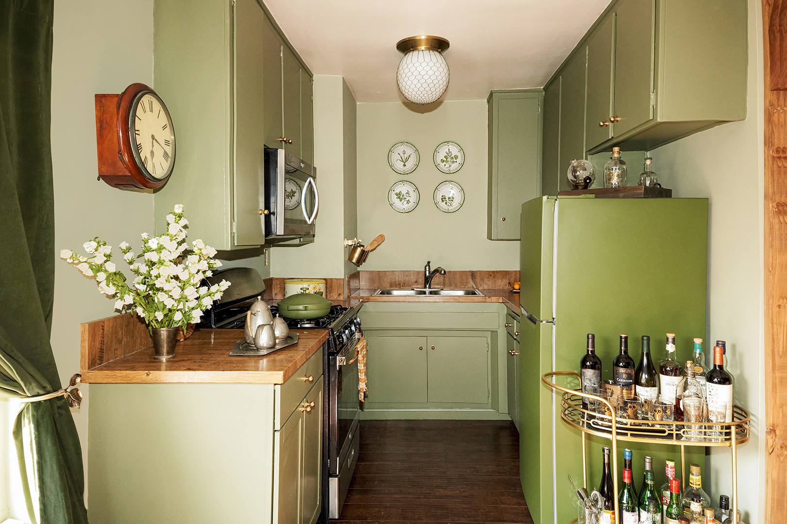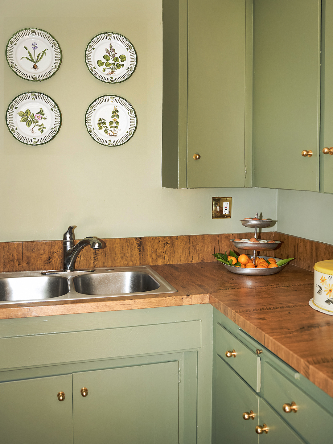 One shade wasn’t going to cut it. After landing on Dunn-Edwards’s Moss Covered for the cabinets, Thomas scoured the fan deck for a light green for the walls. “People sometimes think that if they are doing a dark color on the cabinets, they should keep the walls white, but that creates a lot of contrast,” she explains. “I didn’t want contrast here. I wanted it to feel soft and cozy.” So the rest of the space got swathed in a coat of Dunn-Edwards’s Turtle Trail.