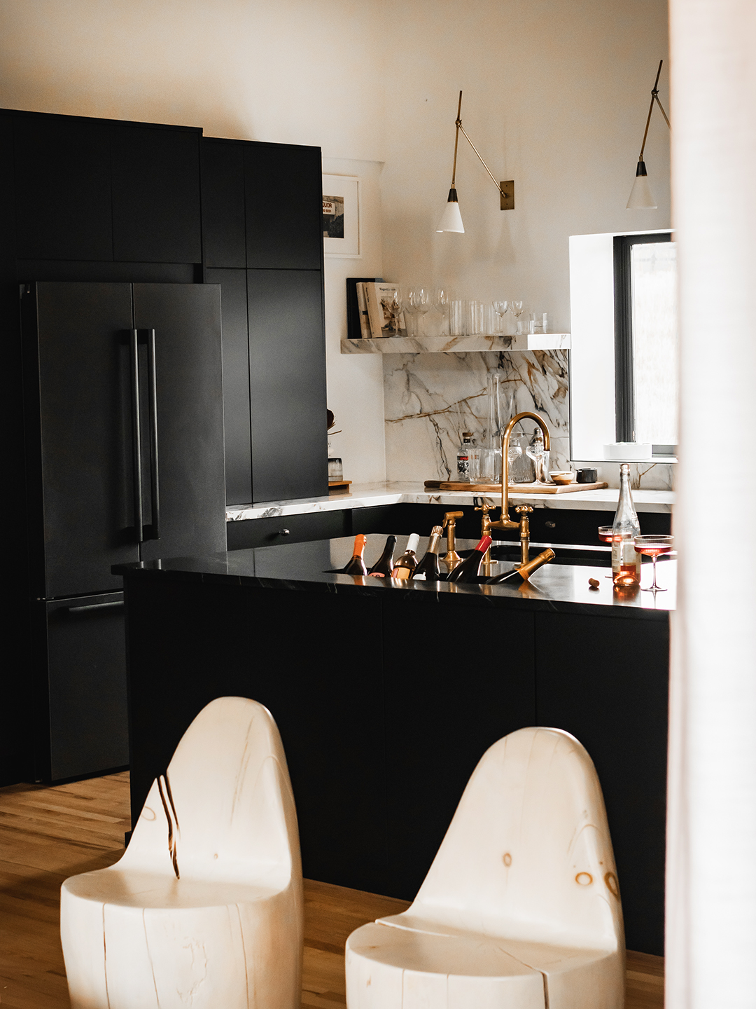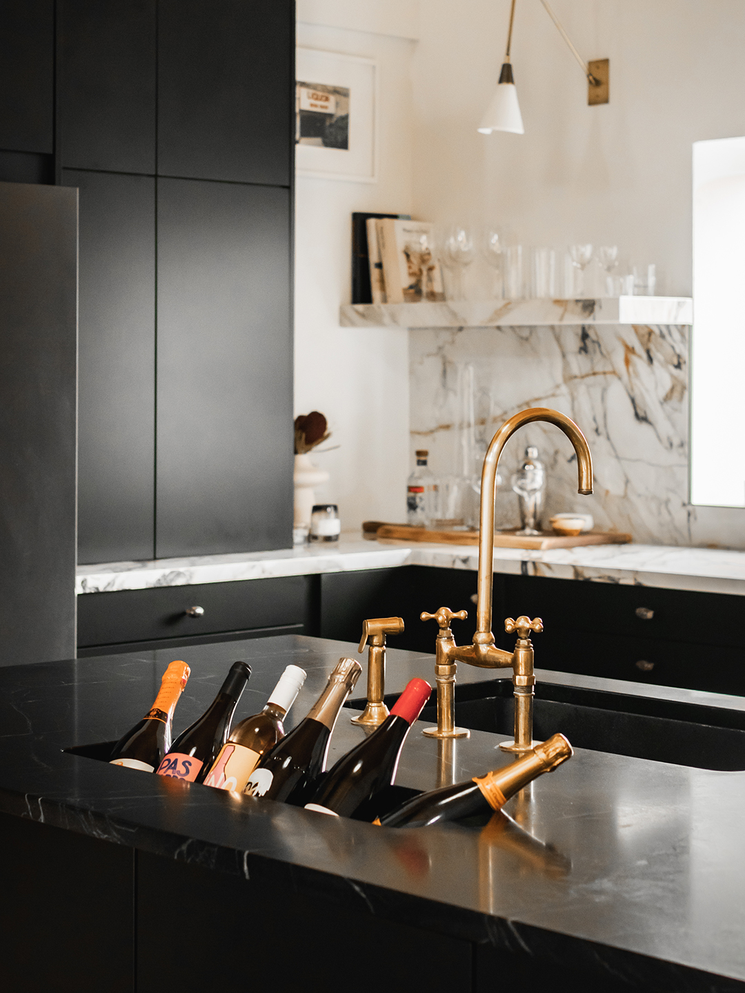 The bubbly sink quickly made her list of must-haves, but it came with its own set of hurdles—dare we call them champagne problems? The biggest being assembling the right teammate to take on the project. Once she found a stonemason who was open to the challenge, she talked him into using soapstone, which is nonporous, instead of marble. In the end, the island became the control center of the kitchen, housing the main sink, a dishwasher, trash bins, storage, seating, and—of course—a narrow beverage station that can house up to six bottles on ice.