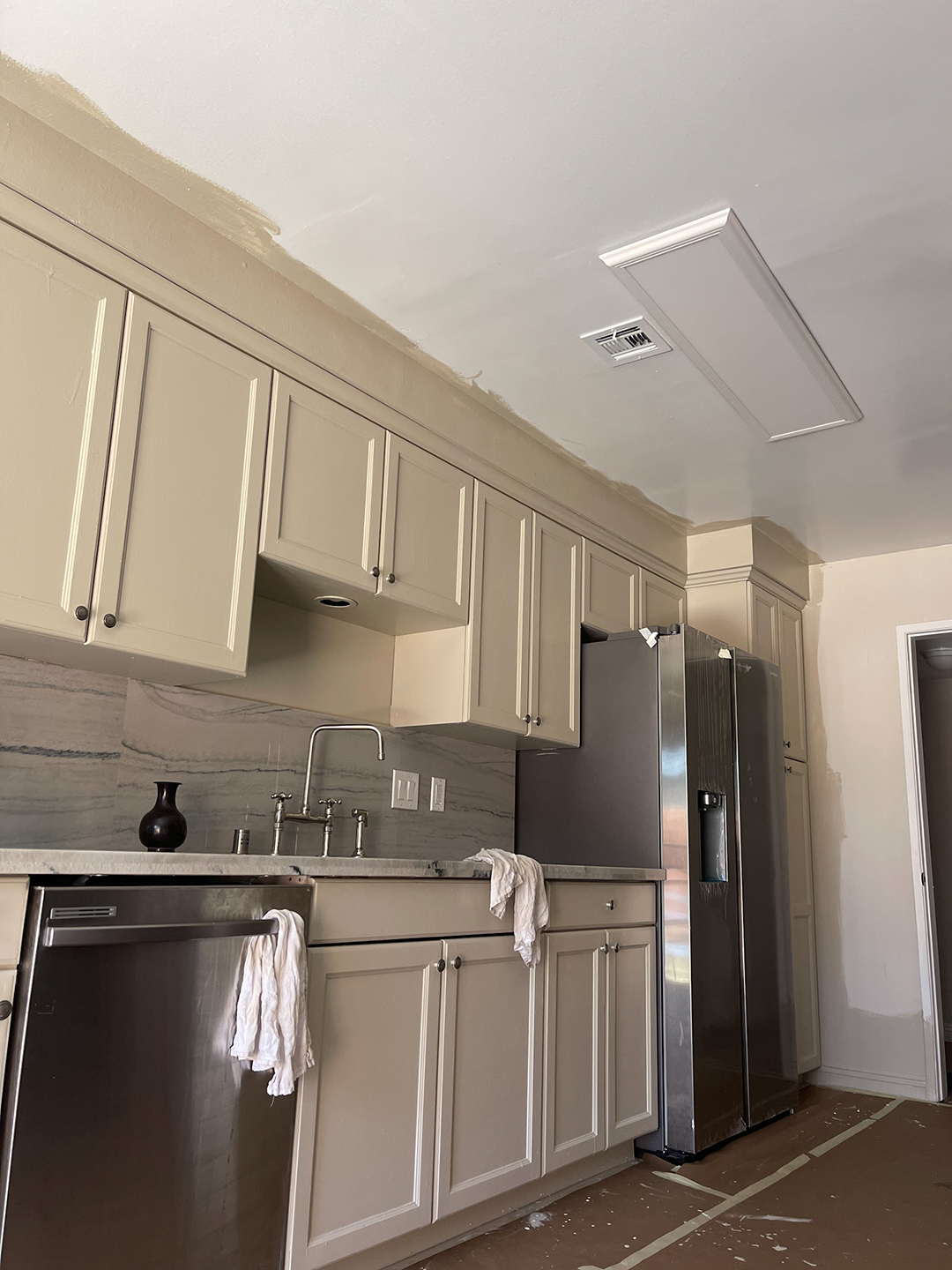 I used packing paper, tape, and a drop cloth from our move to prep the kitchen for painting and sanding.
