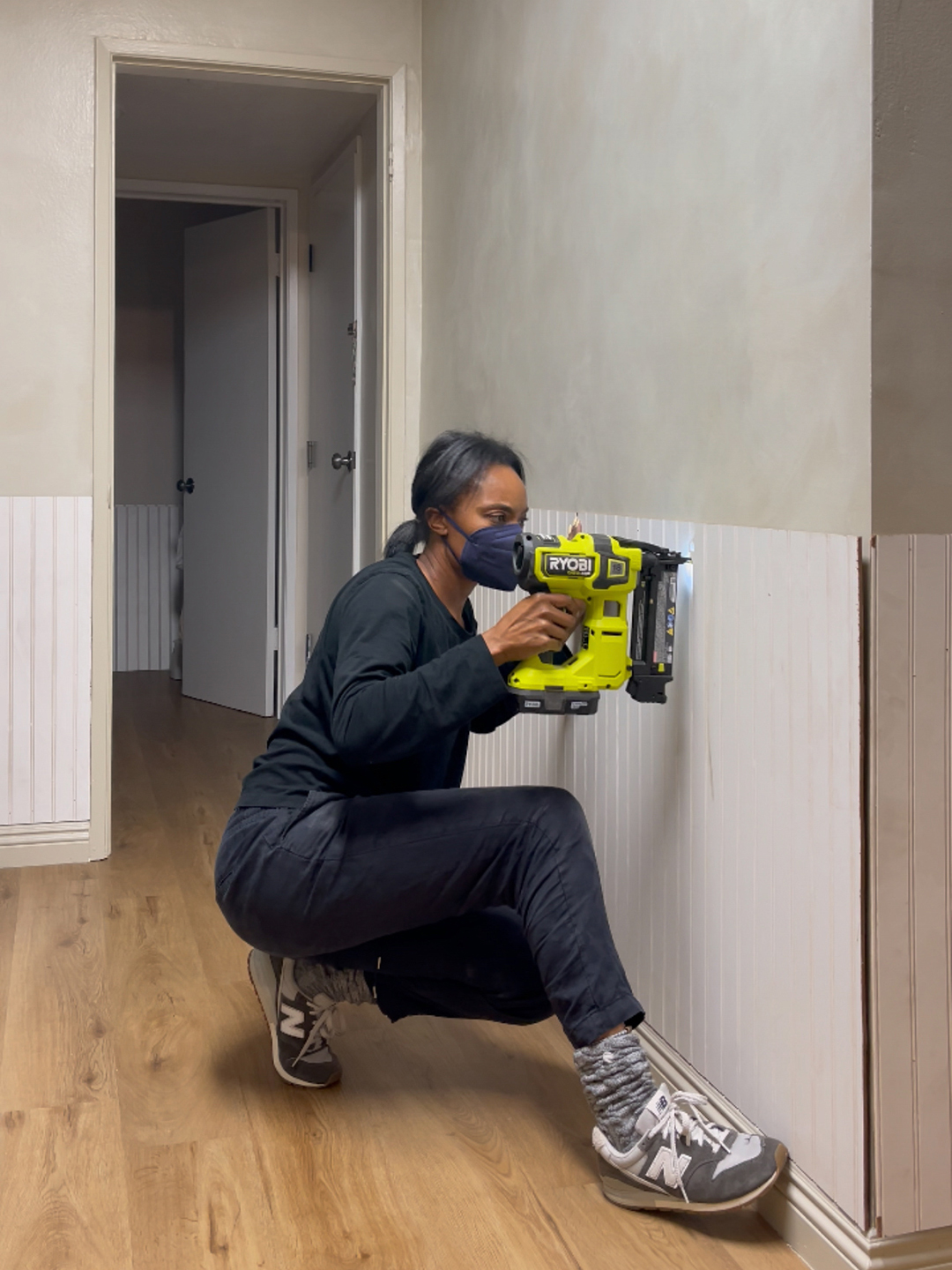 I love how quaint beadboard is. I used a cordless jigsaw to cut each [panel], added a little glue to the back of the board, and then applied each one to the wall with a nail gun.