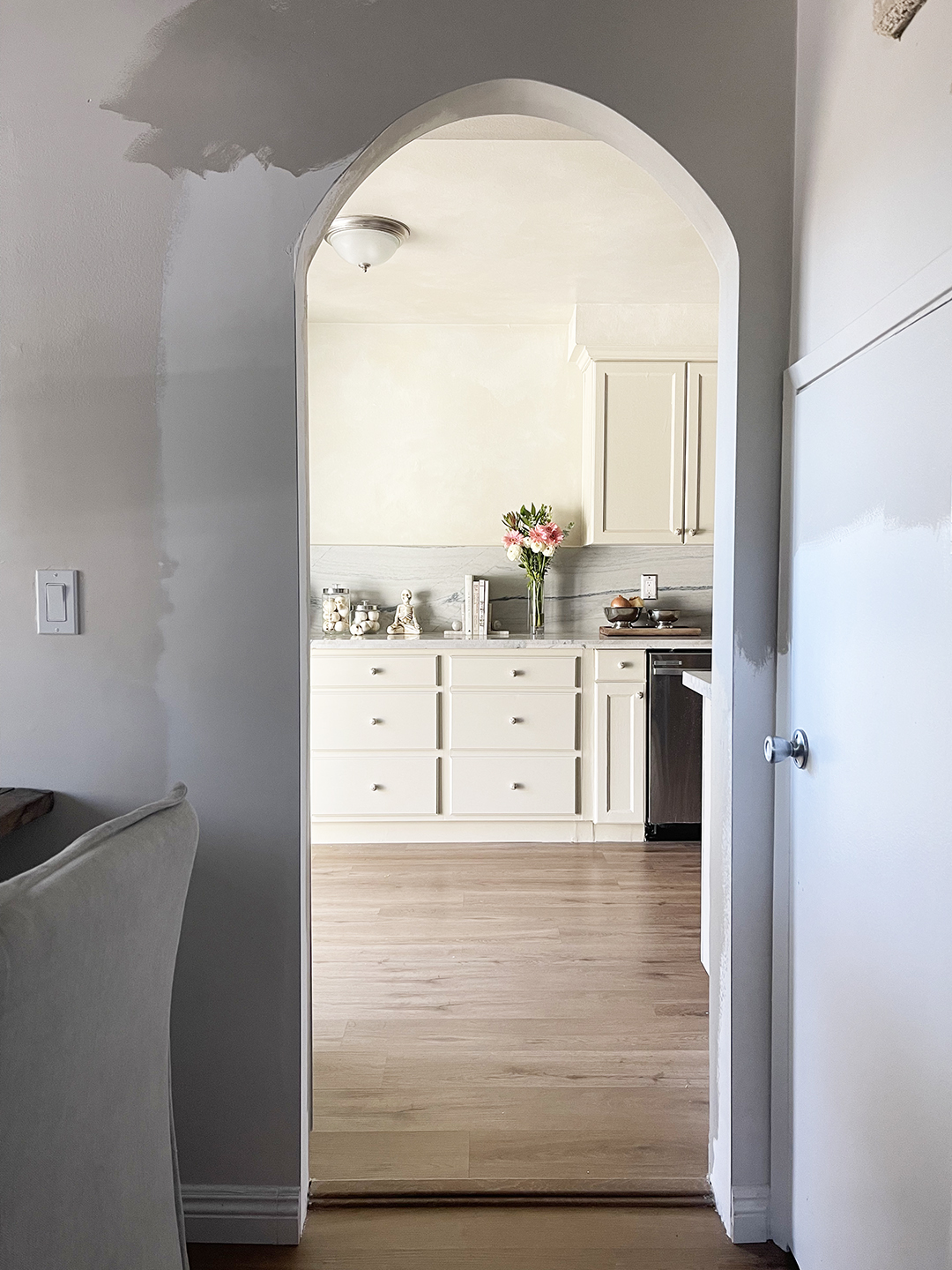 I had one of my contractors come in to create a new arched entry into the kitchen (and I offered to assist for a better price). I love doing this because it allows me the opportunity to learn. We used wood and drywall to create the arches. The wood serves as a stud that allows us to anchor the drywall to it. My contractor plastered, and I sanded and painted.