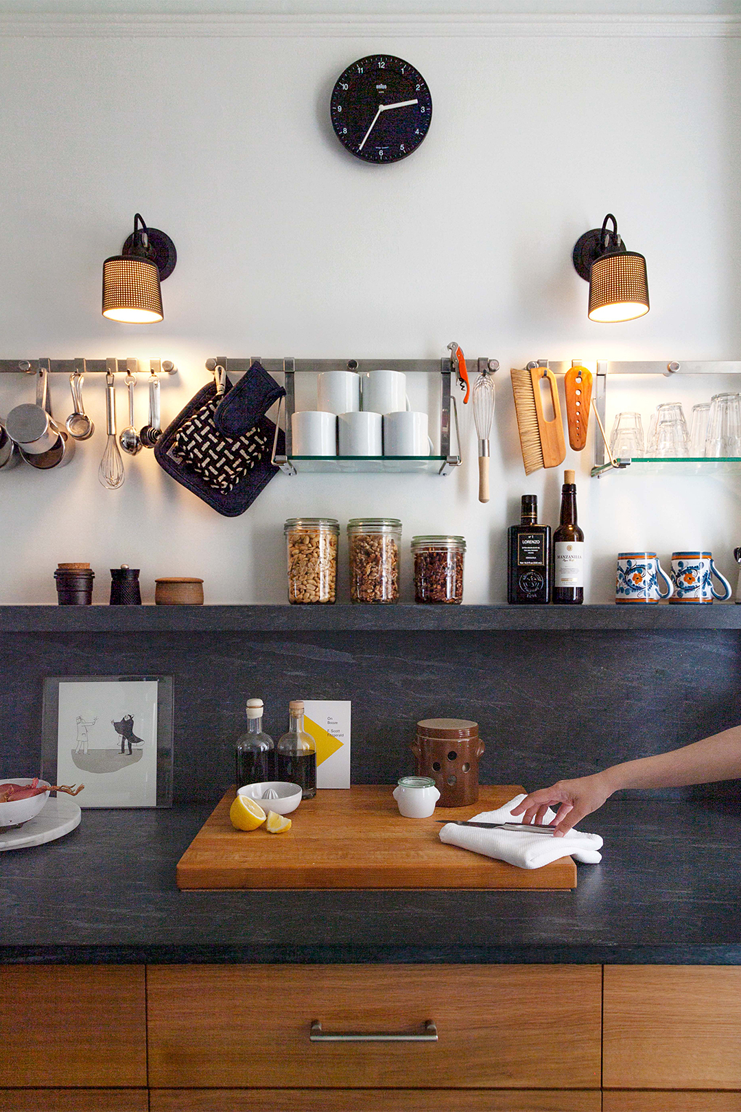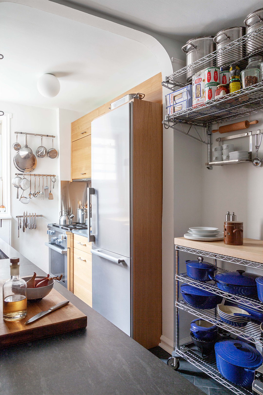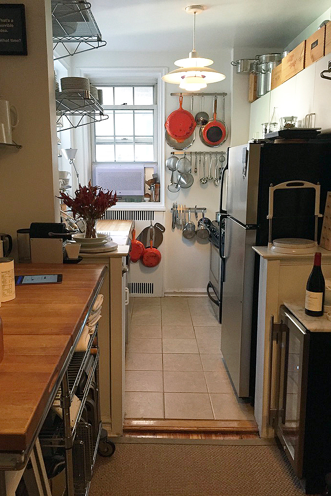 Maiorana debated installing fancier open shelves in his newly transformed space but ultimately decided to stick with his existing Metro shelves. “With the glasses and whiteware, they’re beautiful. Plus they keep bugs away from things,” he notes. Maiorana tasked a maker in nearby Industry City with topping one of his rolling cart units with a 2-inch-thick slab of maple so he could enjoy even more prep space. He kept the industrial feel going by adding smaller shelves and racks from Rosle to hold mugs and hang measuring tools. The small stone overhang that extends from the backsplash also comes in handy for spices. “Even though it’s a galley, it feels very spacious because everything’s lifted up,” he adds.