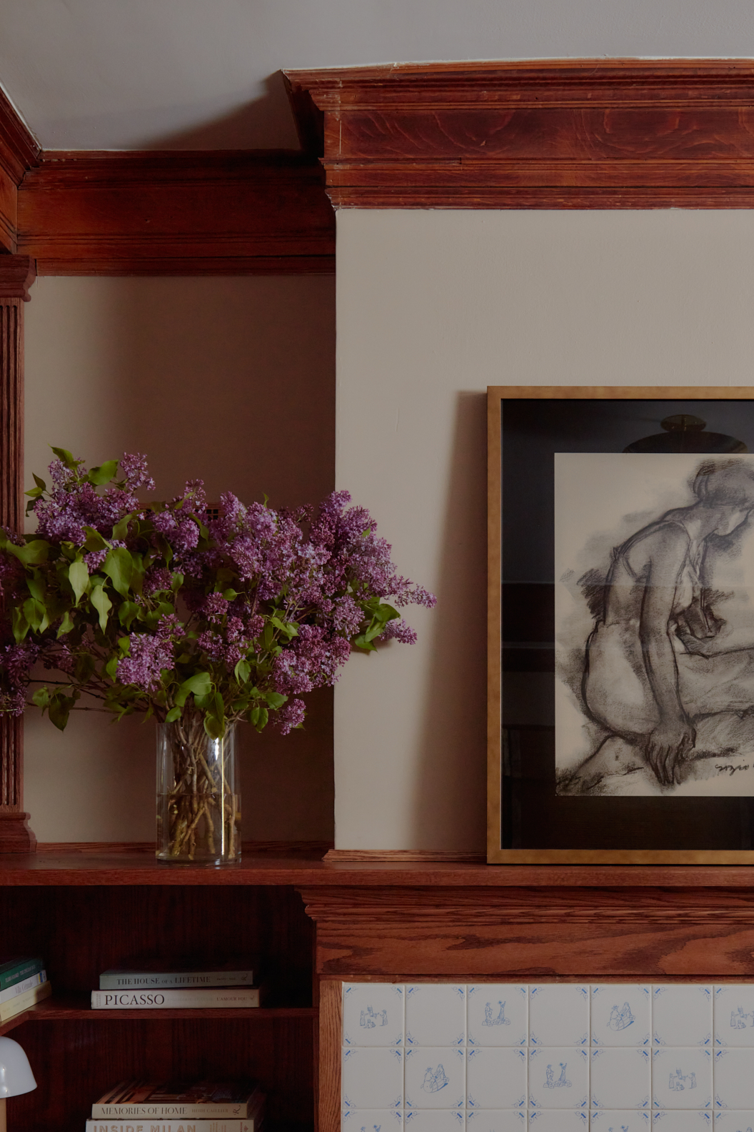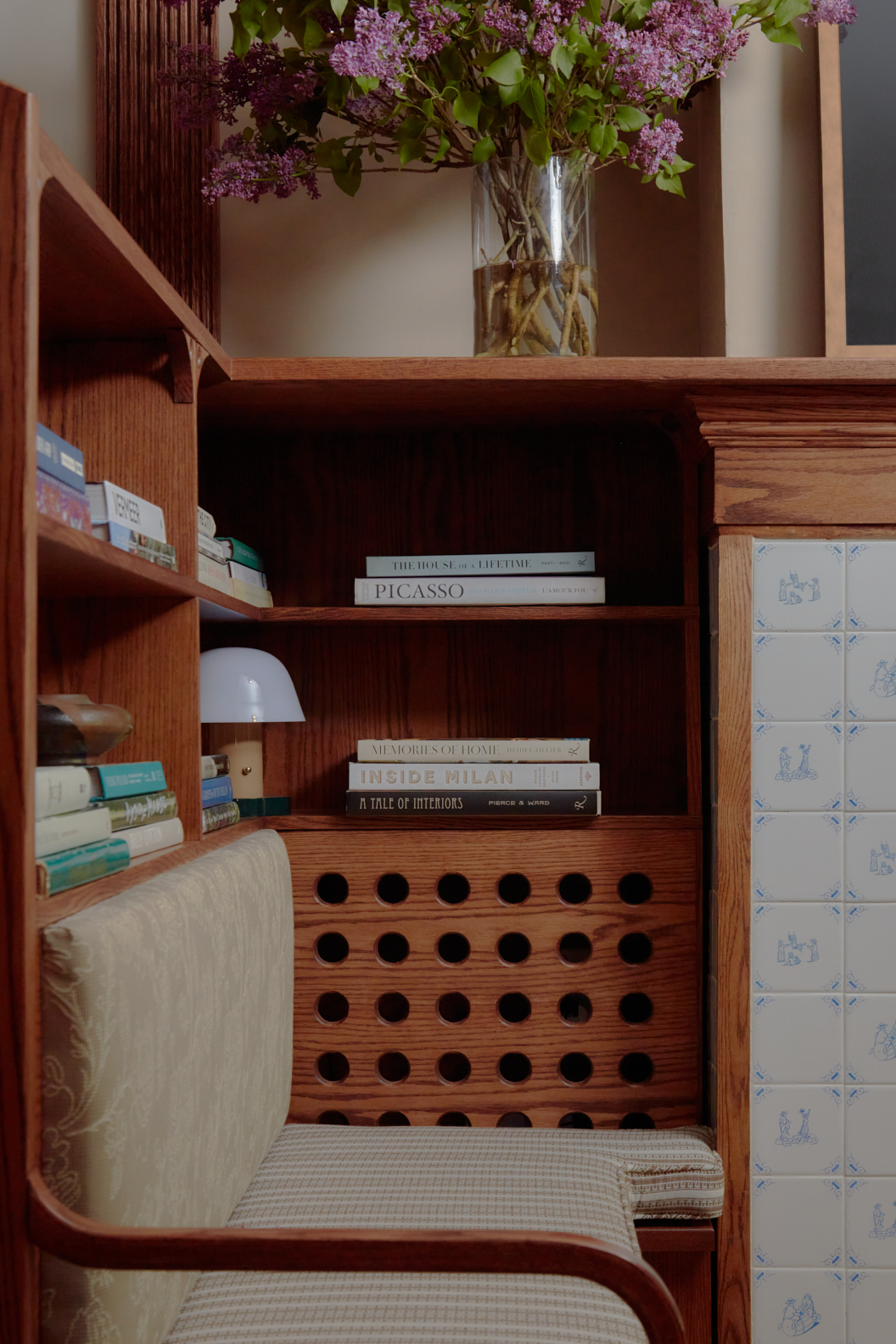 To mark the room’s new function, Velten refreshed the fireplace with Delft-inspired tile from Etsy that shows scenes of children playing. “These homes can feel very, very serious,” she says of choosing a motif that felt equal parts playful and traditional. She finished it off with a hearth made of a limestone remnant.