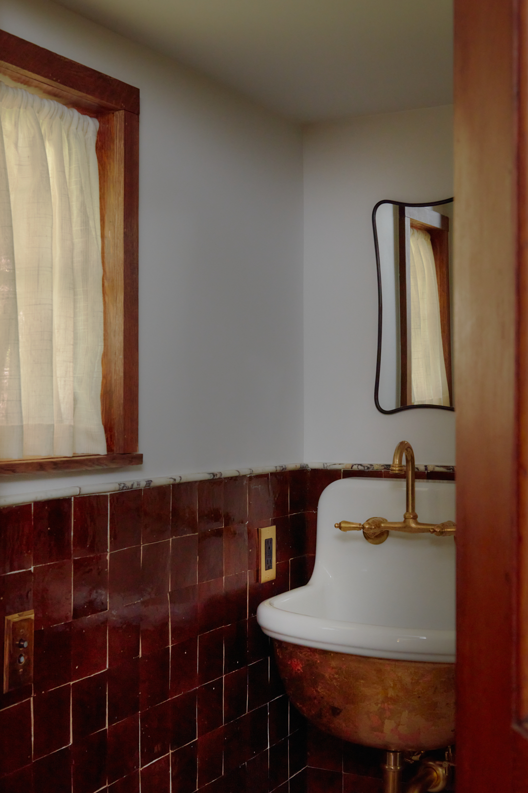 While thinking about how train travelers used to carry precious hatboxes and suitcases adorned with shiny zipper closures, Velten infused the powder room with the same glamorous energy. “I wanted it to be kind of industrial and a little precious,” she says. The designer translated her vision with a copper sink from Watermark Fixtures and red-brown zellige wall tile topped with honed Viola marble bullnose trim.