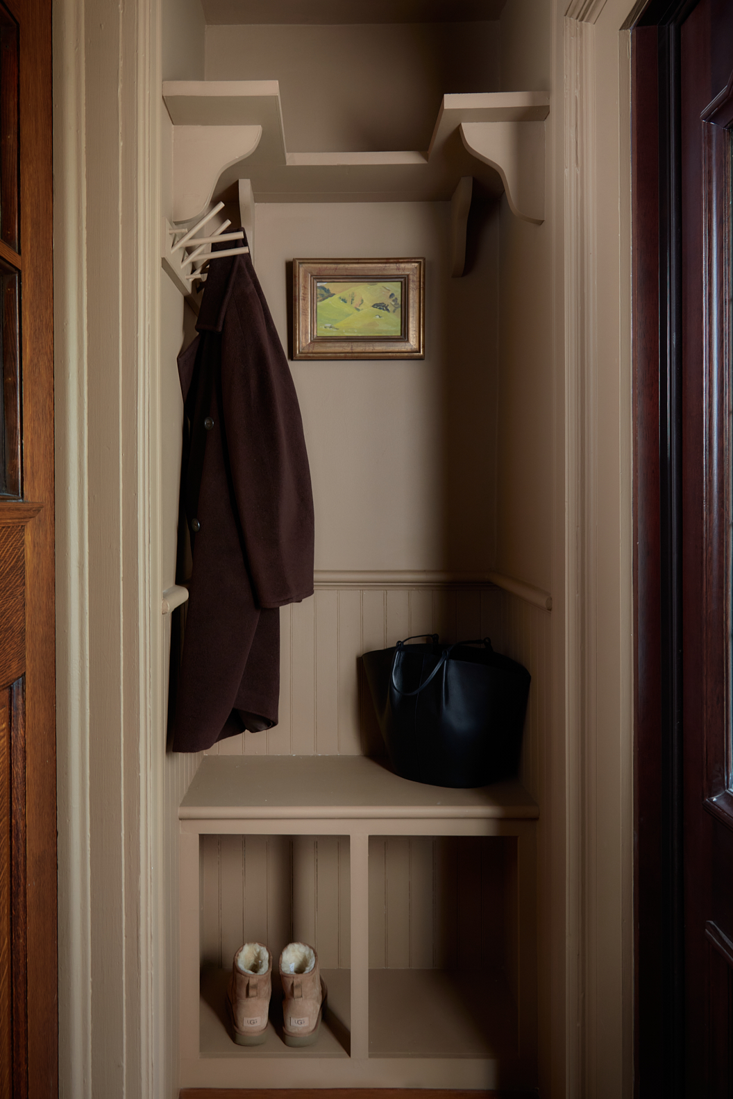 Plus the tiny mudroom by the front door is now outfitted with two small cubbies, a shelf, and Shaker pegs for stashing outerwear. Taking the closet’s place? A built-in bench.