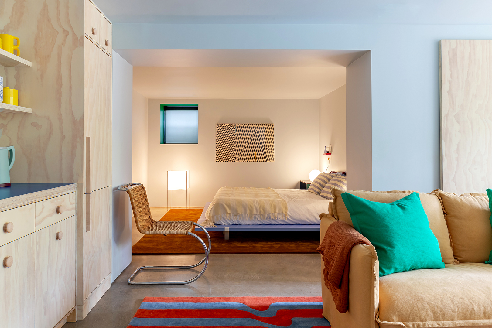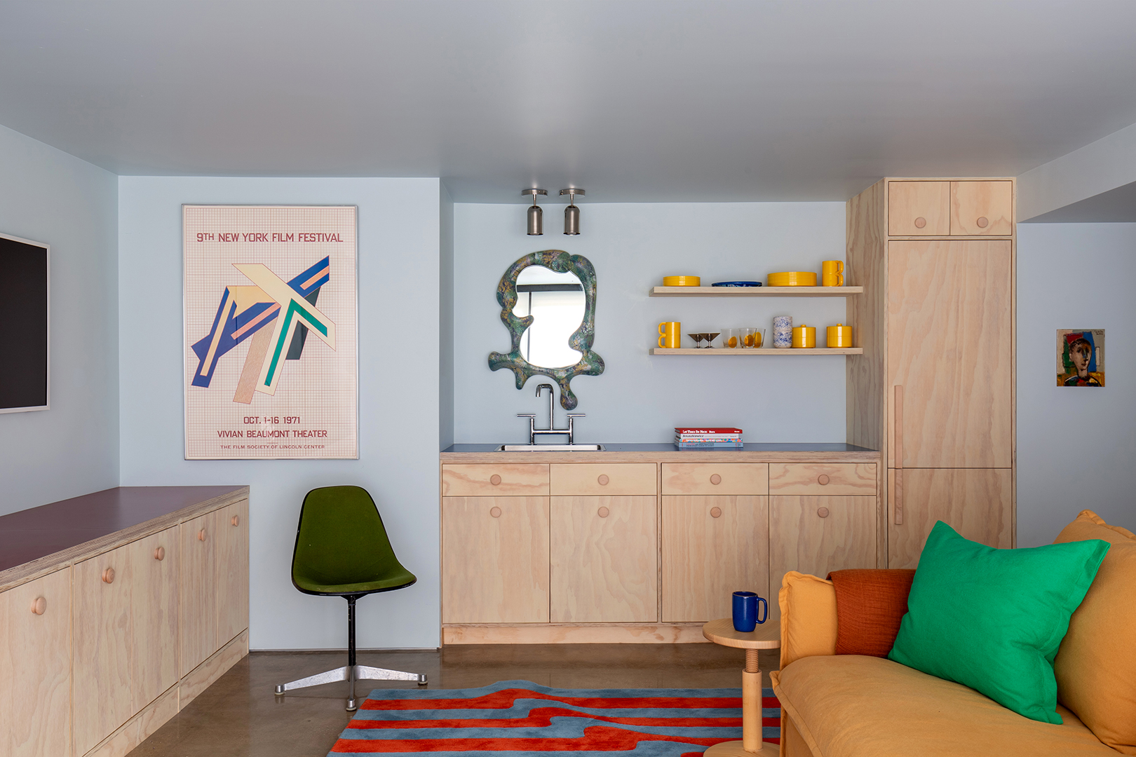 The sealed plywood has a pronounced grain, and it runs on the lower half of the living room’s main wall and across to the custom kitchenette. The oversize unfinished knobs are a smooth contrast to this surface, while complementing the overall “vibrant utilitarian” vibe of the project.