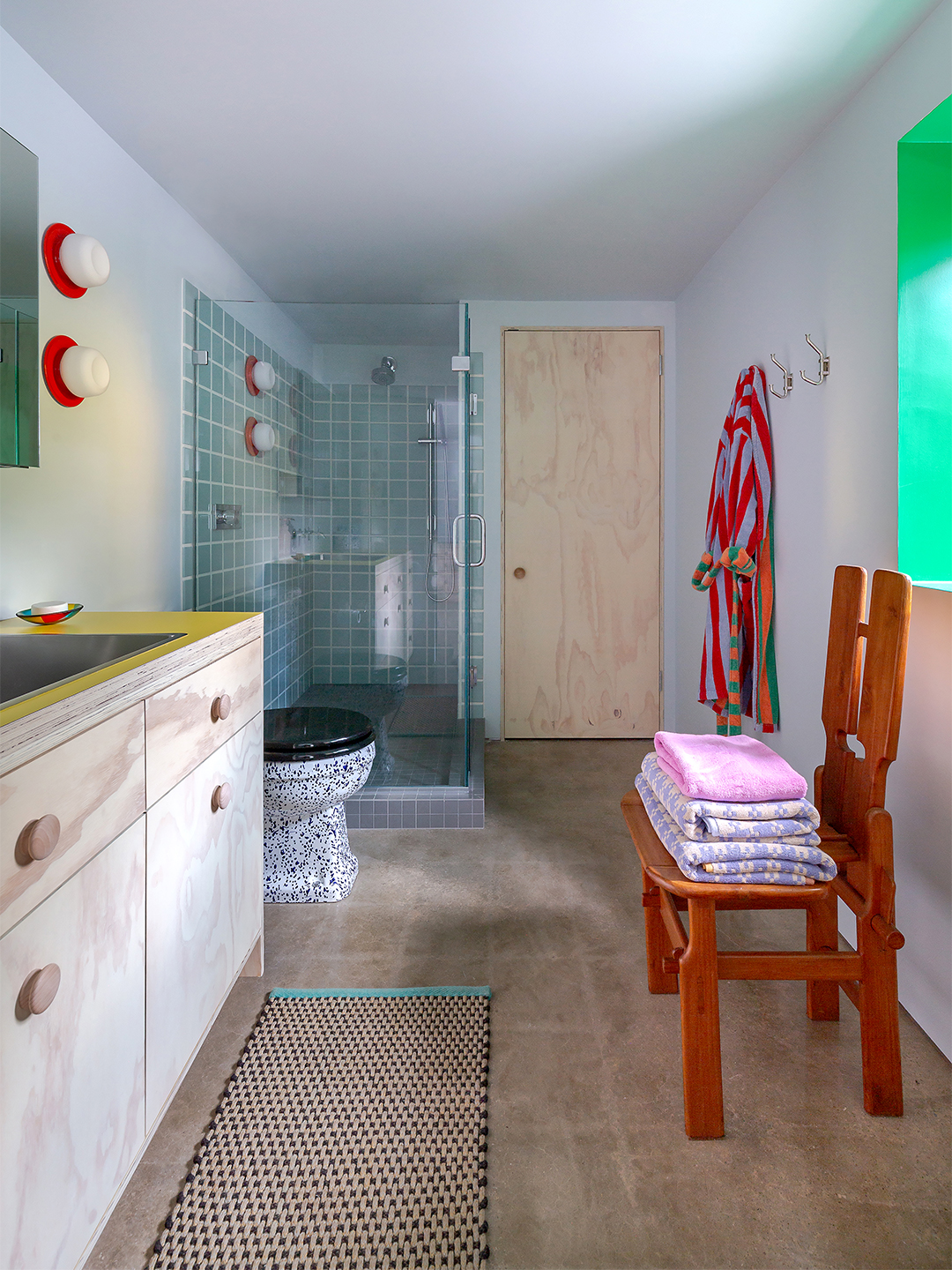 Even the neon yellow on the bathroom vanity fits in, thanks to other retro details in the space, like the small-scale square shower tile and the splatter-painted toilet Heller had shipped from the U.K. Because the concrete and plywood act as neutral anchors, every whimsical flourish seems to work. “I picked a palette that would make people happy, because that’s how I wanted people to feel when they went down there,” Heller says. “Transforming a space that was so dark and dreary with color proves that it really can change everything.”