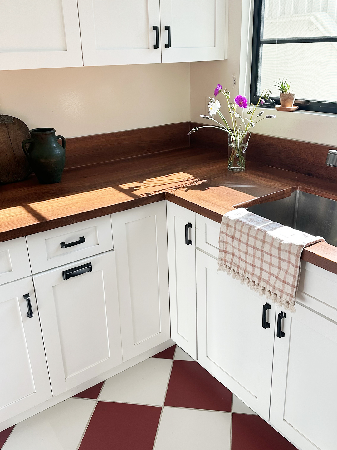 In an effort to restore his rental kitchen’s 1920s charm, design influencer and TikToker Marco Zamora swathed his white countertops in a butcher block–inspired option that has proven to withstand exposure to moisture around the sink.