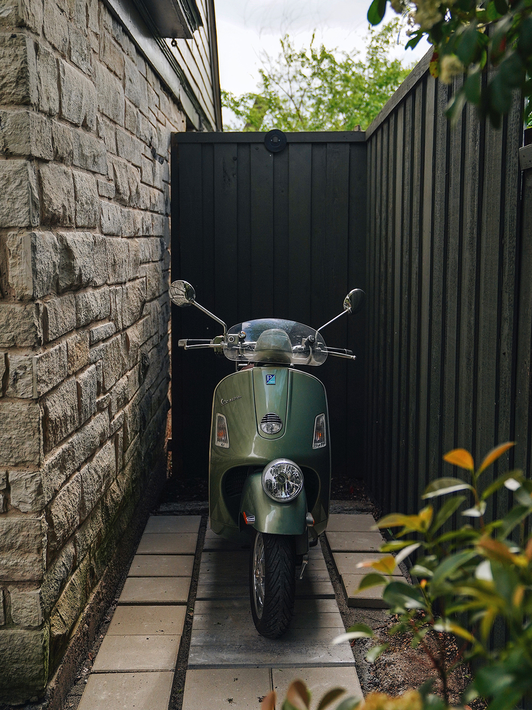 The Vespa was an impulse purchase following a vacation Eddie and Angelee took to Italy and Paris pre-pandemic. The cool ride served them well downtown, and it still comes in handy in the suburbs. “We’re able to zip around to our favorite coffee shops and restaurants,” says Eddie. For when it’s not in use, the couple carved out a nook in the backyard by ripping out raggedy bushes and laying down gravel and concrete pavers. We’re guessing that project got them in the mood for pasta and croissants.
