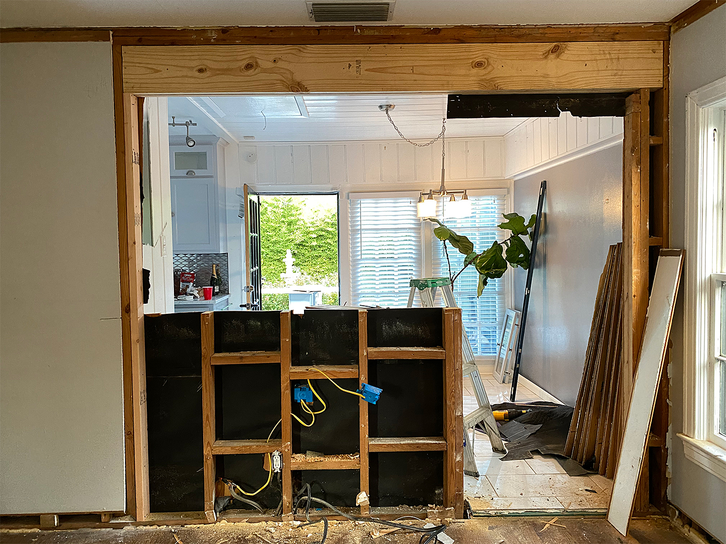 To create more of a visual connection between the two spaces without compromising storage in the kitchen, they opted for a half wall and paid homage to the 1941 home’s curves with an arched opening.