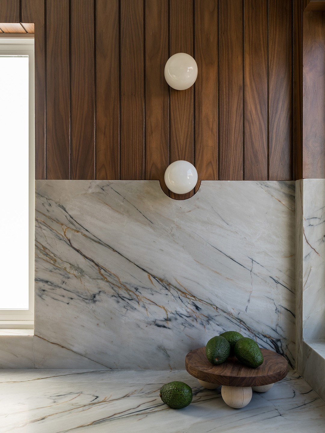 Quartzite was always on Naber’s radar for the countertops and backsplash: It’s much more kid-friendly than stain-prone marble. The designer exhausted her search, aiming to find a light gray slab with minimal brown streaks. Once the stone was in the space, she had some fun with it, mitering part of the backsplash around the globelike wall sconces. “The homeowners are down-to-earth, not buttoned up. This detail made the kitchen feel a little less serious,” she says.