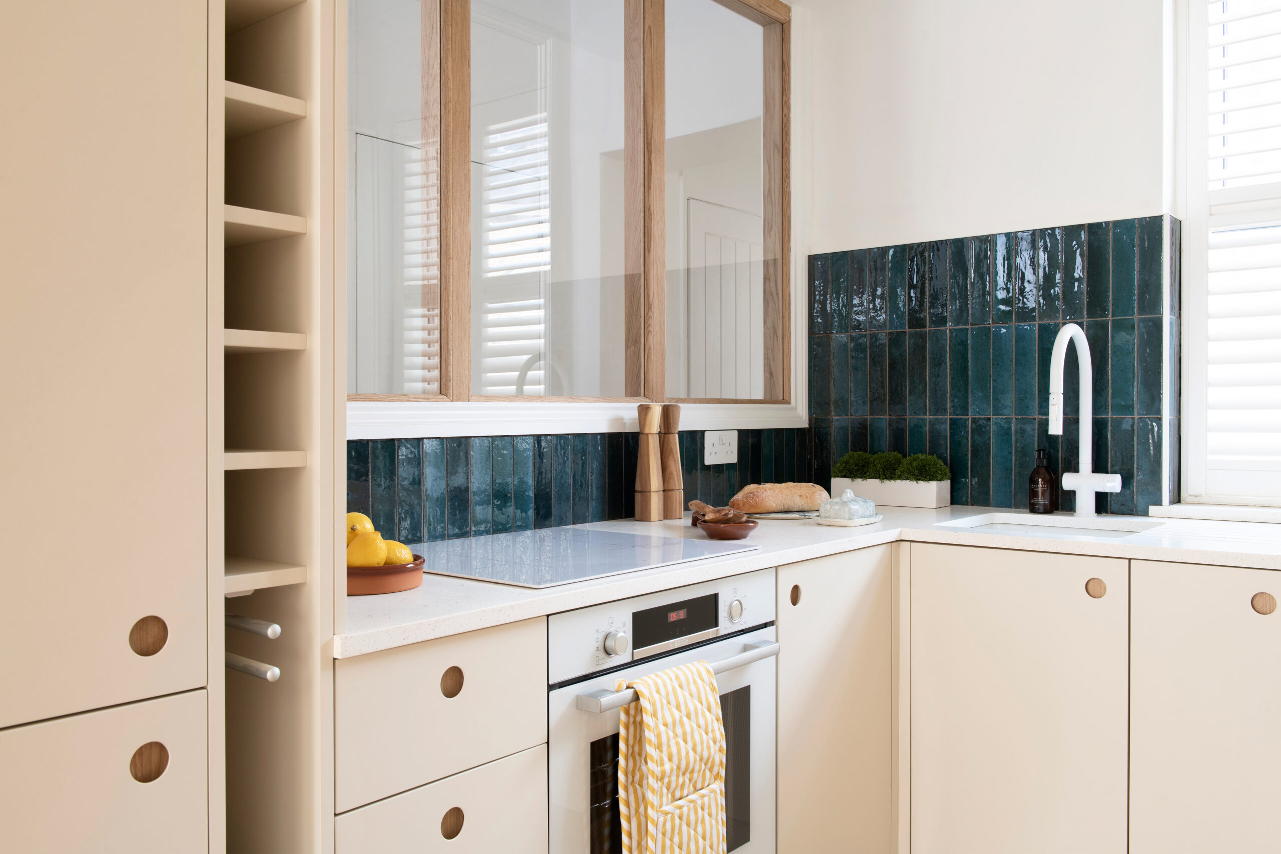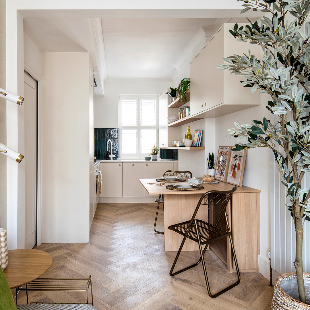 There are only so many ways to make a tight kitchen feel airy and spacious without taking down a wall or three. Luckily, British designer Alexandria Dauley knows them all. And when she was hired to overhaul the kitchen in a client’s 550-square-foot flat in London’s Battersea neighborhood, the founder of Dauley Designs put those space-saving smarts into practice. “It was slightly awkward and quite narrow,” Dauley remembers; the appliances had been crammed into any empty cranny. “But the bones were good.”