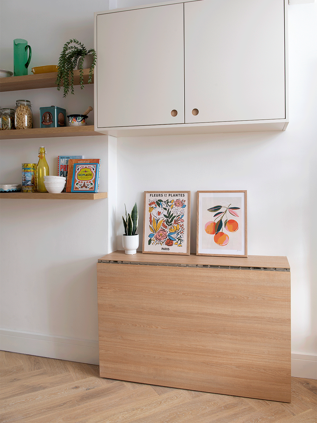 Starting from scratch, Dauley could maximize every square foot. The standard door that separated the kitchen from the hallway got the boot for a barely there pocket style. The niche next to the refrigerator? That’s now wine and tea towel storage. Even the countertops work harder; Dauley had a drain board carved into the surface next to the sink, nixing the need for a dish-drying rack. But the real magic is in the pop-up dining area. Before, her client made do by pulling seats up to a folding IKEA table. Dauley gave the concept a major upgrade with a built-in gate-leg design that not only stows away flat (leaving a ledge for knickknacks), it stores a set of elevated folding chairs.