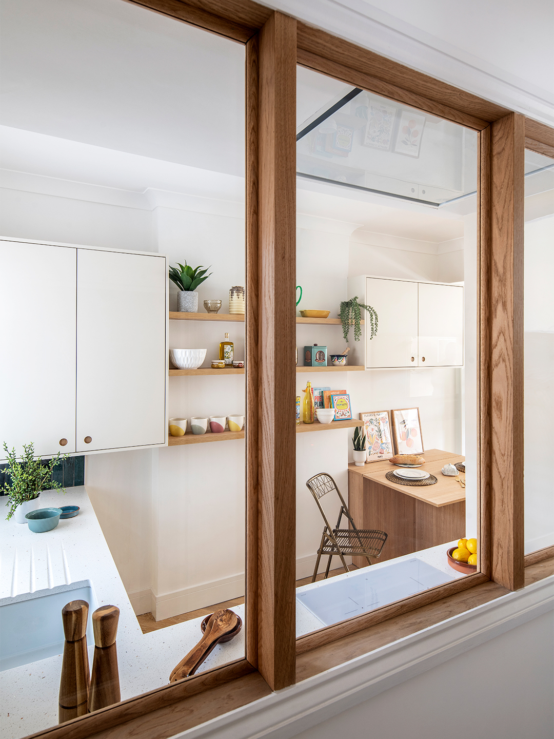 Remember the unsightly vent hood? Even with the new interior windows, some kind of extractor was still necessary, but the designer was able to inset one into the ceiling. “Actually very handy for small spaces,” she points out.