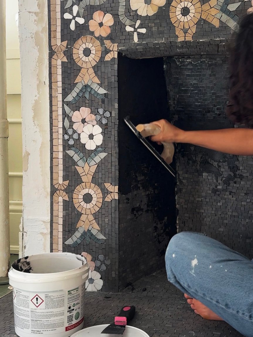 “We started by removing the old mantel, which wasn’t original to the house and actually butted up against a steam pipe, then we repaired some damaged plaster,” says Stearns. “Next, I realigned the bricks at the base of the fireplace and covered them with a coat of joint compound, then waited two or three days for everything to fully dry before priming the whole space with Kilz primer. Once that dried, I spread the mortar and added the mosaic pieces. I did the inside part first, then the floor area, and the surround the following day. I then waited two days for that to dry and then grouted the entire thing, which was probably the hardest part of the whole project.”