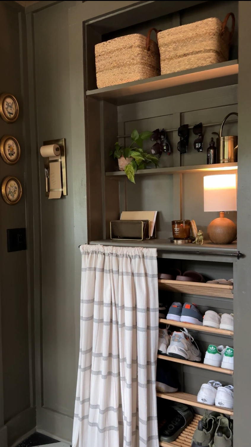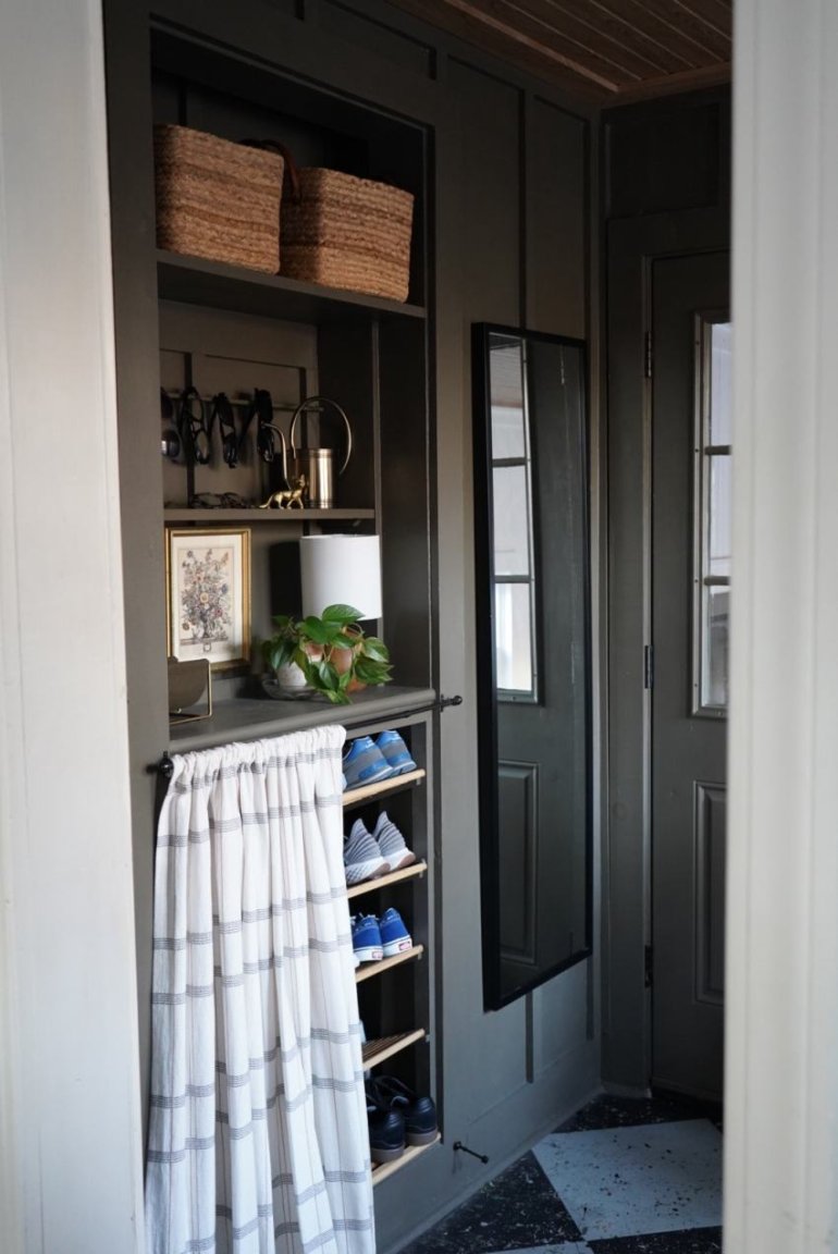 She mounted the curtain on a cafe rod along the base of the countertop. Now, it looks like a beautiful skirt when no one is digging for their sneakers.