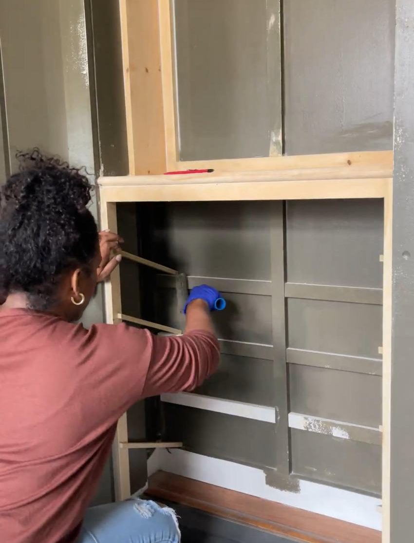 Using her saw, she trimmed the ends of the piece to fit perfectly on top of her supports, securing it with brad nails and adding scrap wood around the edges to give it a little more definition and character. Then, it was time to fill in any gaps with caulk before swathing the millwork around the bamboo shelves in Patio Stone by Behr.
