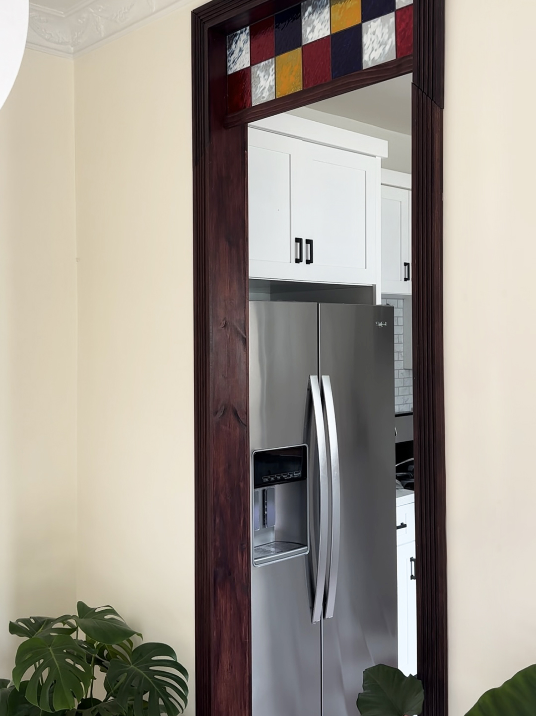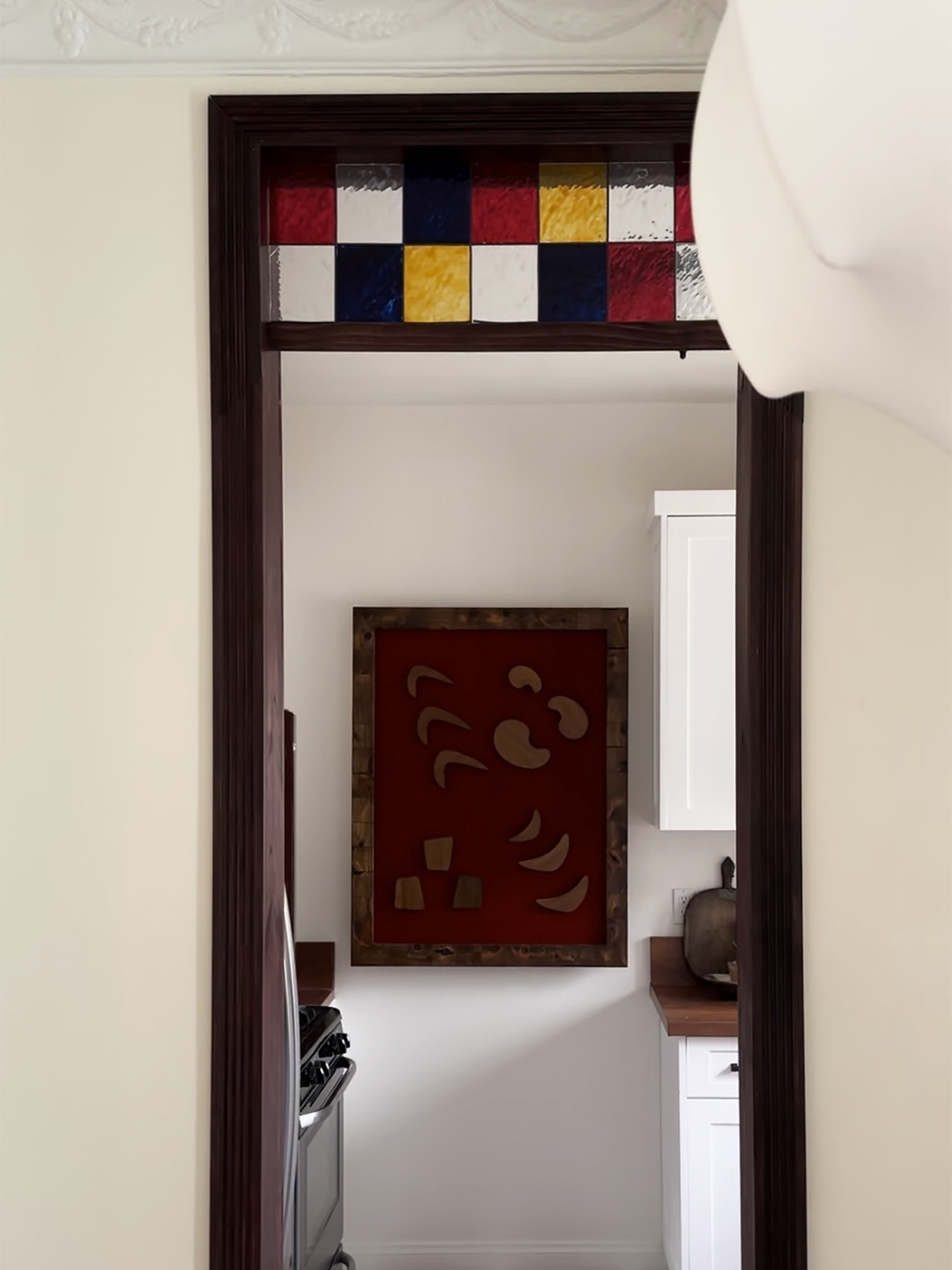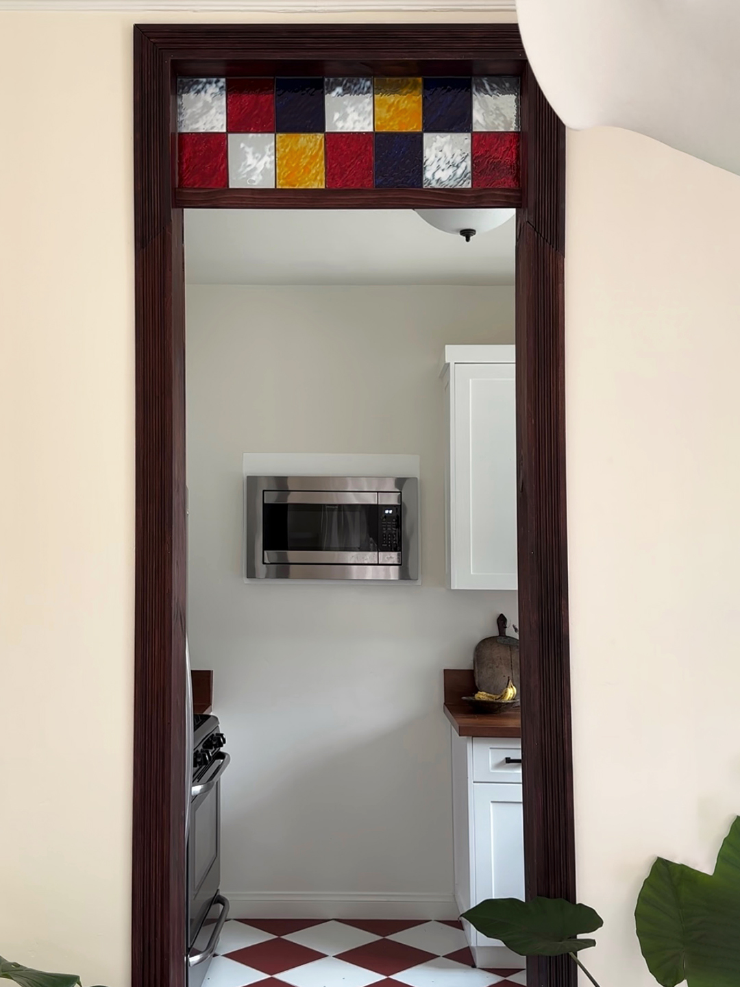 Zamora’s only rule for updating his kitchen was that anything that he put up had to be something he could easily take down. This included the new doorframe he made out of wood blanks from the hardware store and cut with a compound miter saw in the back of his apartment complex. After staining the boards with a dark brown finish, he nailed the three pieces together and then to the existing threshold. But he wasn’t done yet: Zamora topped the doorway with a faux stained-glass transom window made out of lightweight plexiglass, faux lead lines, and a glass paint set.
