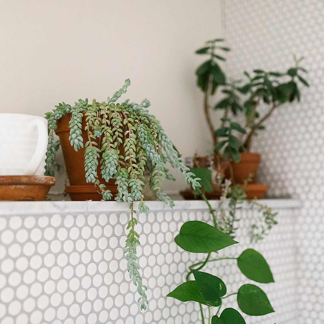 While the bathroom’s footprint is exactly the same, it looks like they gained a few extra feet of space because there’s no longer a fiberglass tub and curtain bisecting the room. The glass partition (a $300 Wayfair score) allows sunlight to reach every corner, including all the small potted plants on the tippy-top shower shelf. The perch is topped with a scrap piece of marble the couple got for free when they were purchasing other reno materials at Hoosier Carpets Plus.