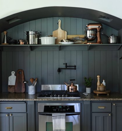 Ward painted the existing black kitchen cabinet fronts in Benjamin Moore’s Chocolate Candy Brown, but not in just any finish. You can credit the super-high-gloss look to car paint. It took several attempts to get a proper color match, and they had to vacate the house for 30 days while the fumes dissipated, “but when you make it work, it’s so satisfying,” she says.