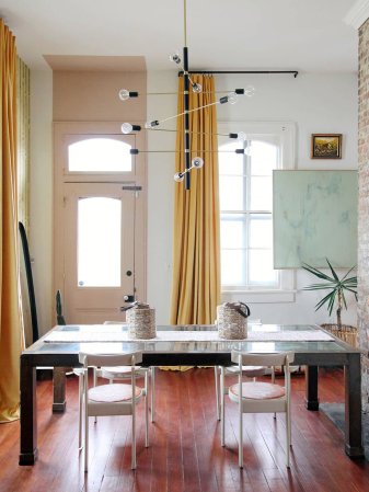Inspired by kintsugi, the Japanese art of repairing broken pottery with gold, Ward patched the kitchen backsplash behind the stove—“a really cool-looking Formica that was unfortunately broken”—with a slab of pebbly green marble. With the leftovers, she patched the gap in the floor where she had opened up the dining room to the living room. Waste not, want not.