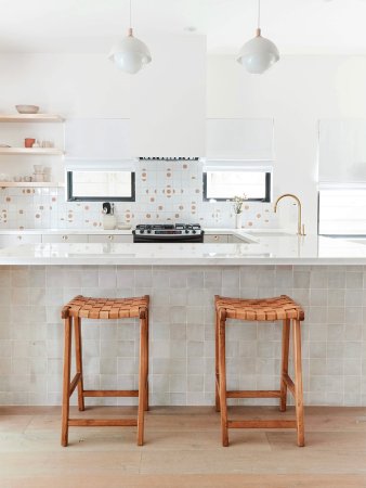 You would think that the kitchen and primary bathroom’s existing 1970s IKEA cabinetry would be the first thing to go, but “when you’re designing spaces from scratch all the time, it’s really fun to just go with what you’ve been given,” she explains. Besides, it was in excellent condition and there was no denying the ample storage it provided. “The wood inside aged perfectly, and the old European hinges were made so much better than new ones,” Ward adds. So she set out to imbue the industrial interiors—think: concrete floors and stainless steel countertops—with the warmth she’s known for, but without a gut renovation. “I decided to lean into what felt organic and Japanese,” she says. The resulting transformation was so impressive, the kitchen graces the cover of our special collector’s Makeover issue, on newsstands now. Here’s how the designer reimagined both spaces with a few strategic upgrades.