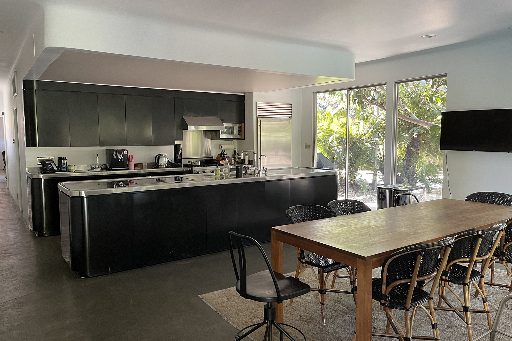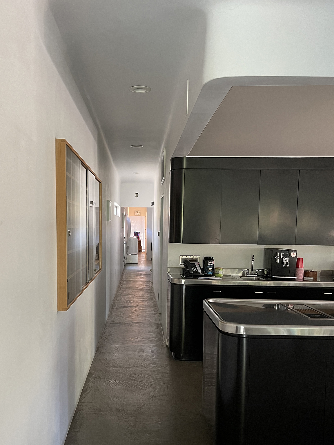 In its previous life, the kitchen ceiling was a sea of harsh fluorescent office lighting. Just as with the rest of the space’s imperfections, though, Ward and Ribisi chose to lean in rather than tear out. Custom shoji screens now diffuse the light, another nod to the house’s Japanese vibe.