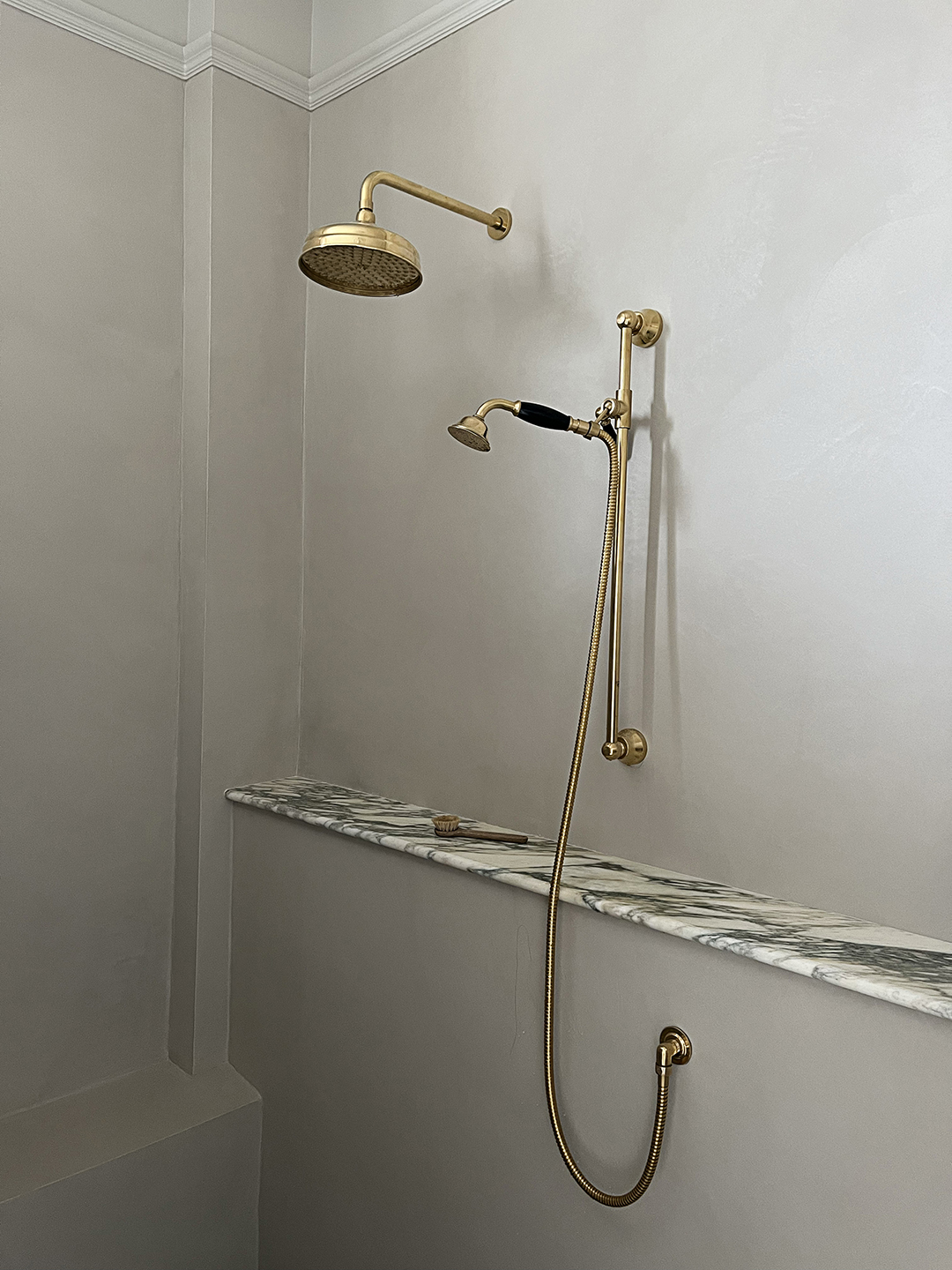 Swathing the shower in plasterlike microcement gave the bathroom additional old-world charm, but Kilroy’s decision to extend the treatment beyond the wet zone and onto the adjacent two walls was a more practical one. “Most plasterers have minimum square feet required per job, and finishing the inside and outside of our shower wouldn’t have met those minimums,” explains Kilroy, who tasked CMG Finishes with the job. The Forcrete finish, color-matched to Little Greene’s Portland Stone Light (the paint color used throughout the rest of the room), is in fact waterproof.