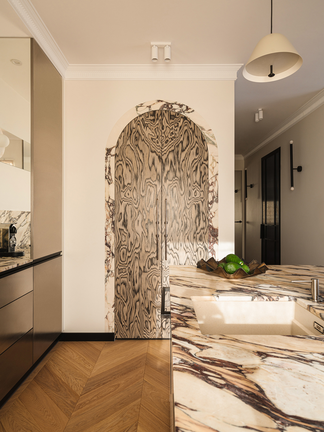 The Sottsass wood shines next to other materials that have a similar swirly design. Peep this combo of Calacatta Viola in Kwoczka’s renovation. “The juxtaposition of the veneer and marble creates a captivating interplay,” says the designer.