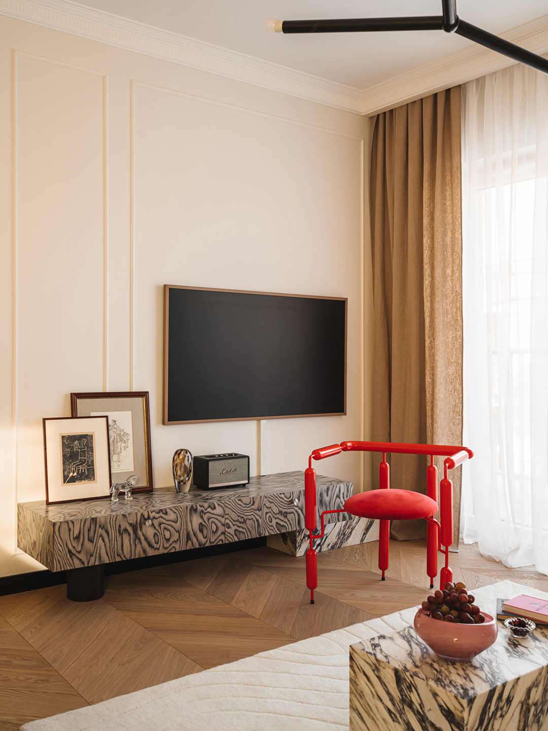 In the living room of Kwoczka’s client’s apartment, she devised a low sideboard that serves as a focal point underneath the TV, “seamlessly blending functionality with elegance,” she shares.