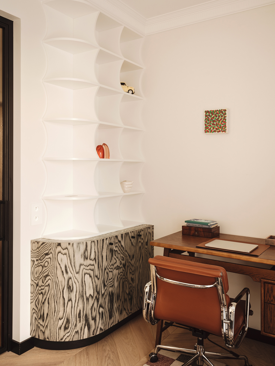 Because veneer is sliced into such thin sheets, it makes it super-malleable and opens the opportunity for curved surfaces. Kwoczka made this home office feel anything but boring by wrapping two rounded cabinets in the Sottsass veneer.