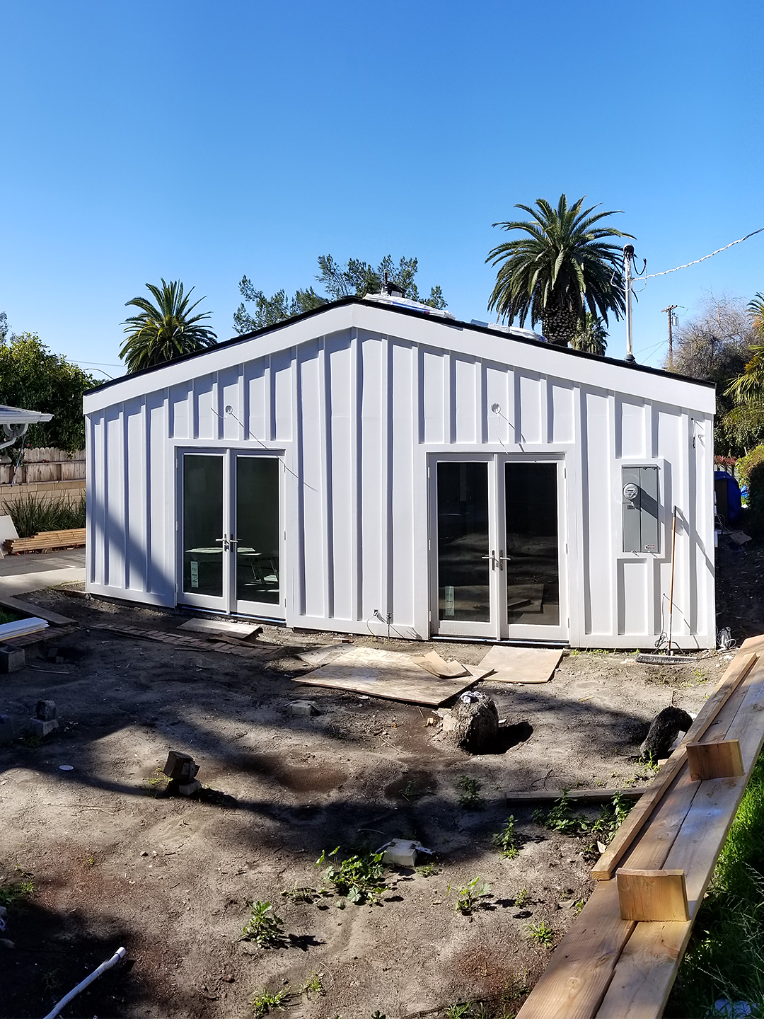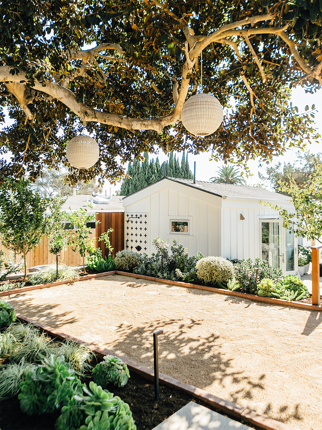 While having a functional front yard isn’t a foreign concept for Californians, Wood completely enclosed the area with a tall fence, creating a courtyard-like feel. “It was important to use every square foot because the house itself is so small,” notes the designer. Another key reason for turning the entrance into an outdoor living room: It faces the sunset. “We did what I like to call Gap and Gucci,” explains Wood. “There are a few really blingy moments like the ipe-wood deck, and then we have a bocce ball court that makes use of a big empty space but is really cost-effective.” Ahead, Wood shows us how she brought their initial blueprints to life.
