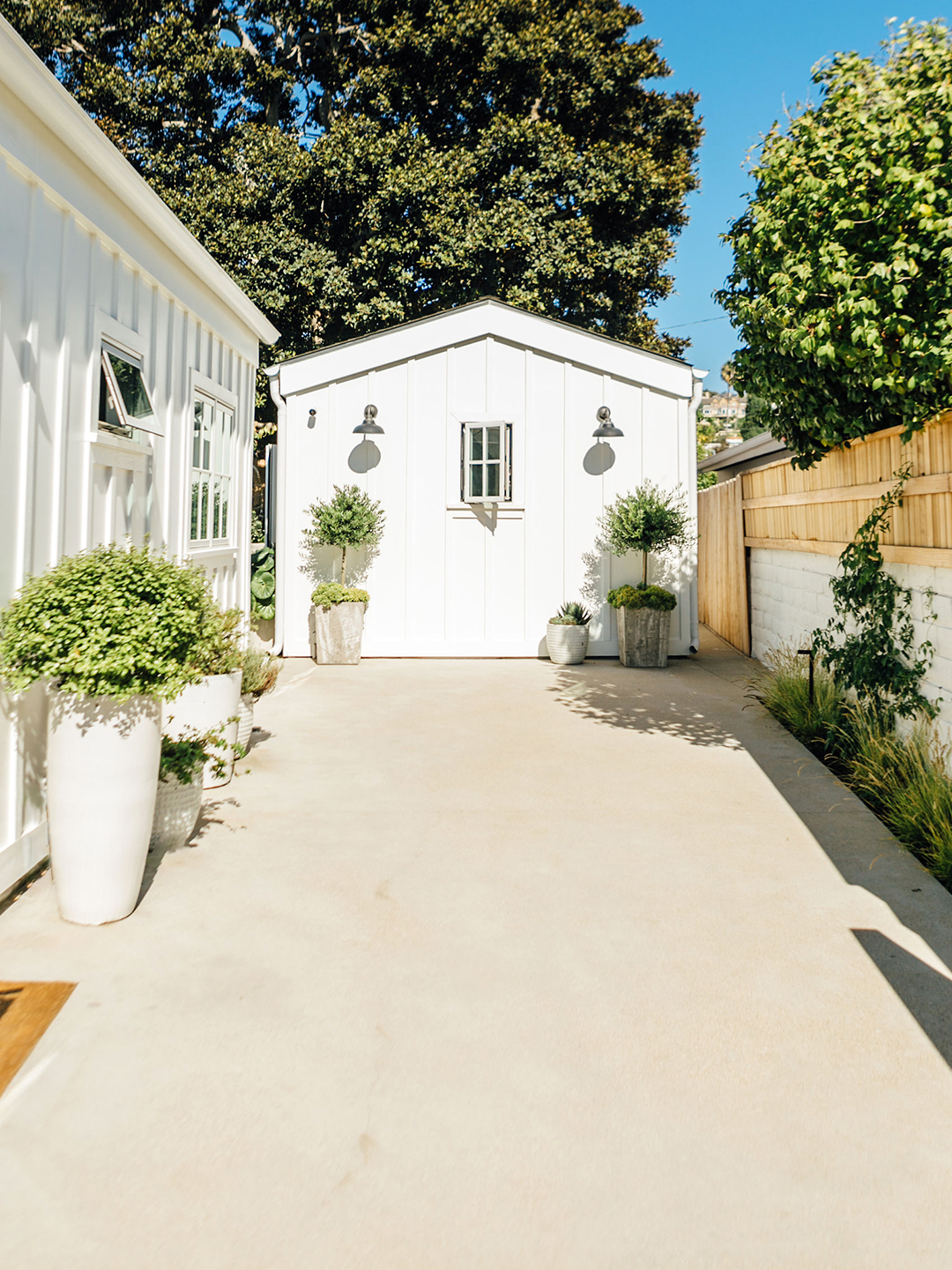 Wood’s big splurge for the front courtyard came in the form of a field-grown olive tree that had to be delivered via crane. And while she could have easily gone for a much younger, smaller option, the age and size of this tree introduced a much-needed sense of history to the space, “making it not feel like it’s brand-new,” she notes.