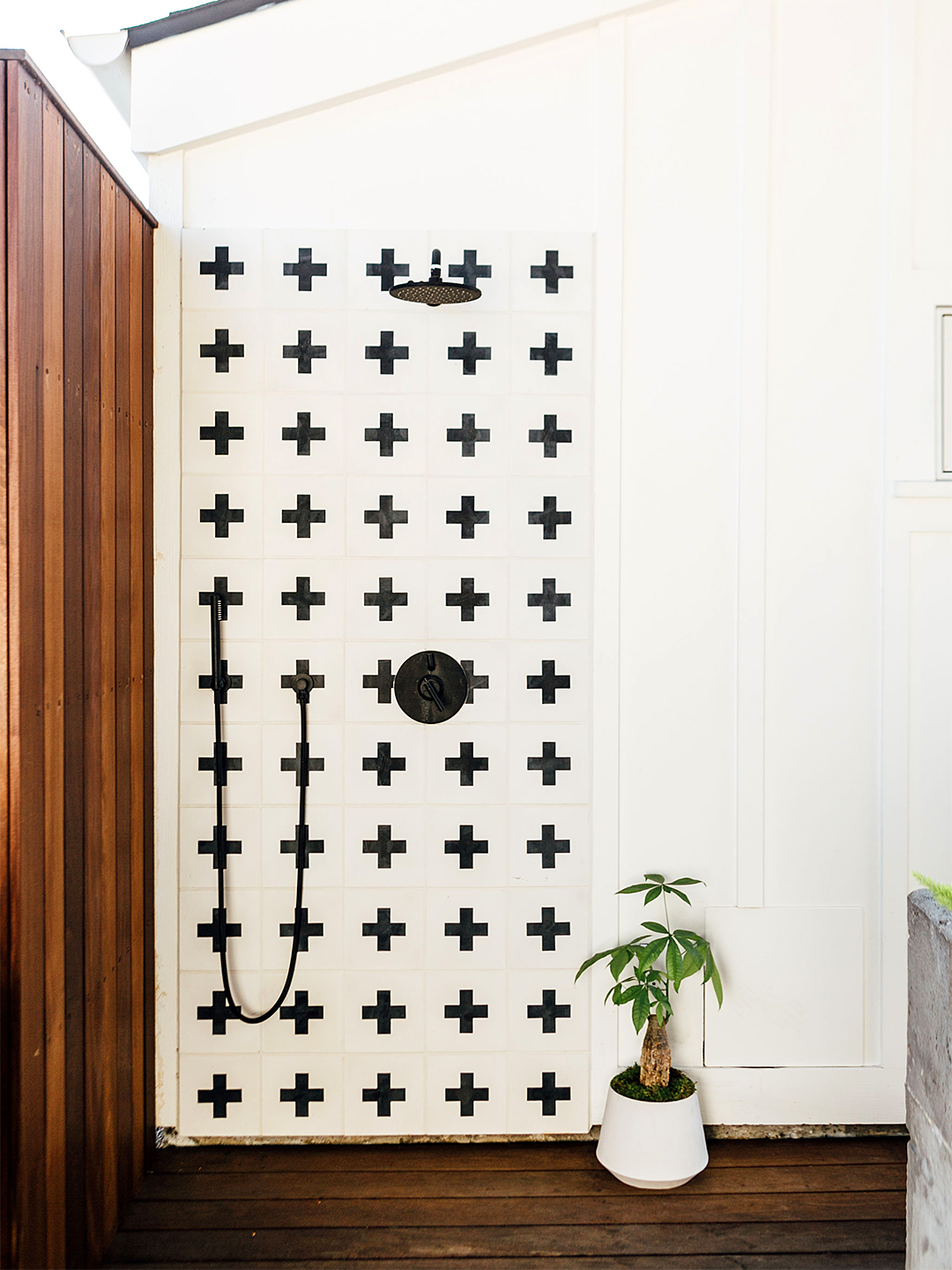 Because there isn’t a proper dining room inside the home, the backyard had to live up to the couple’s entertaining needs. The custom outdoor kitchen features a 42-inch-wide grill so they can barbecue plenty of food at once. And to keep their trips back inside to a minimum, Wood added a mini fridge for drinks and a pull-out trash drawer.