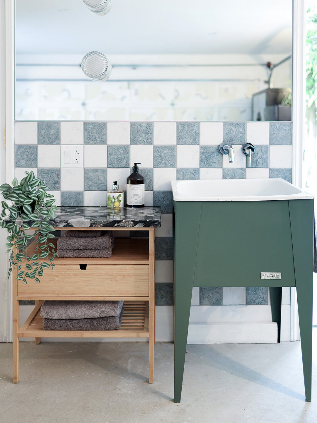 She designed a vanity wall, styling the tiles in a slim checkerboard pattern to create a wainscot-inspired look. The vanity was completed with a large custom mirror, off-center wall sconces, IKEA table, and the Crane sink. The result? An elegant vignette you would never know cost next to nothing.
