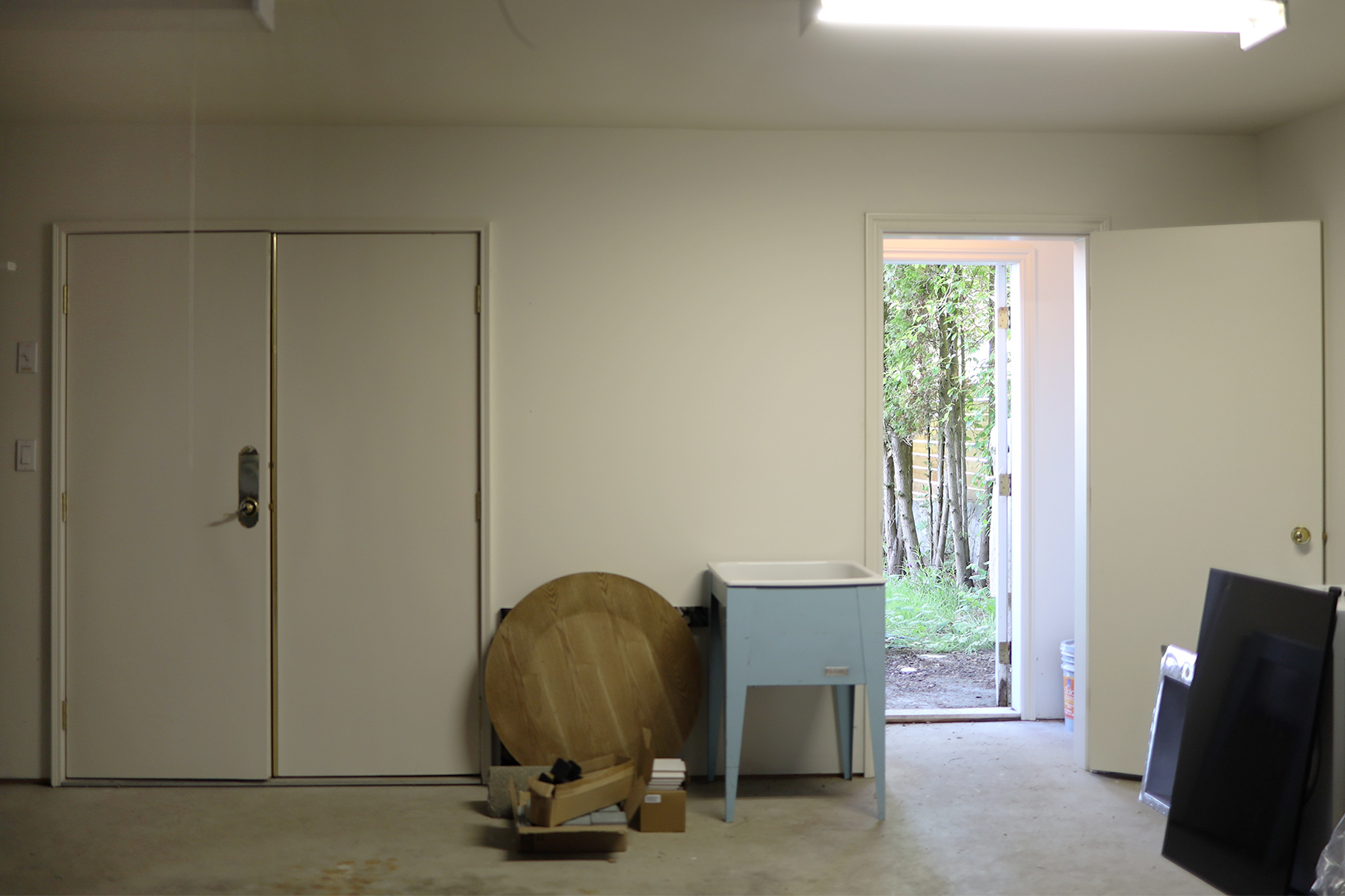 Gill also repurposed a vintage Crane utility sink to act as the new bathroom vanity. “All it needed was some paint and a little creativity!” Gill says. A similar treatment was applied to the existing garage door, doused in a fresh coat of paint and an abstract mural, transforming it from eyesore to art piece.