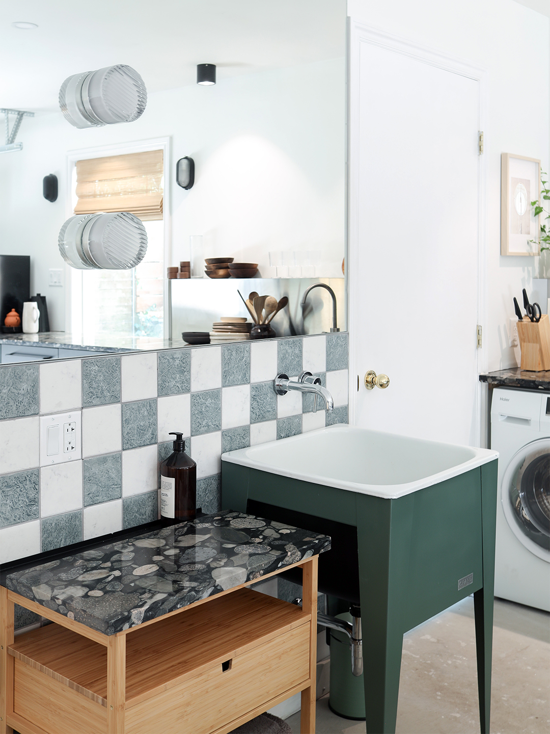 Gill managed to nestle a moody restaurant-like kitchen (“I’ve always wanted to do one,” she notes), living room, bathroom, and even a washing machine into the space once dedicated to storing a car—and she did it all for $14,000, too. The caveat? The family still needed room to park their car. Gill installed clever storage solutions and modular furniture to make it work, but that doesn’t mean it lacked personality. “I wanted to create something that felt fresh, minimal, yet fun,” Gill says. Playful tiling, vintage cabinetry, and pebblelike counters create the illusion that you’re still inside the house. Here, Gill shares how she turned the clunky garage into a do-it-all dwelling, even when they were in a pinch for money and space.