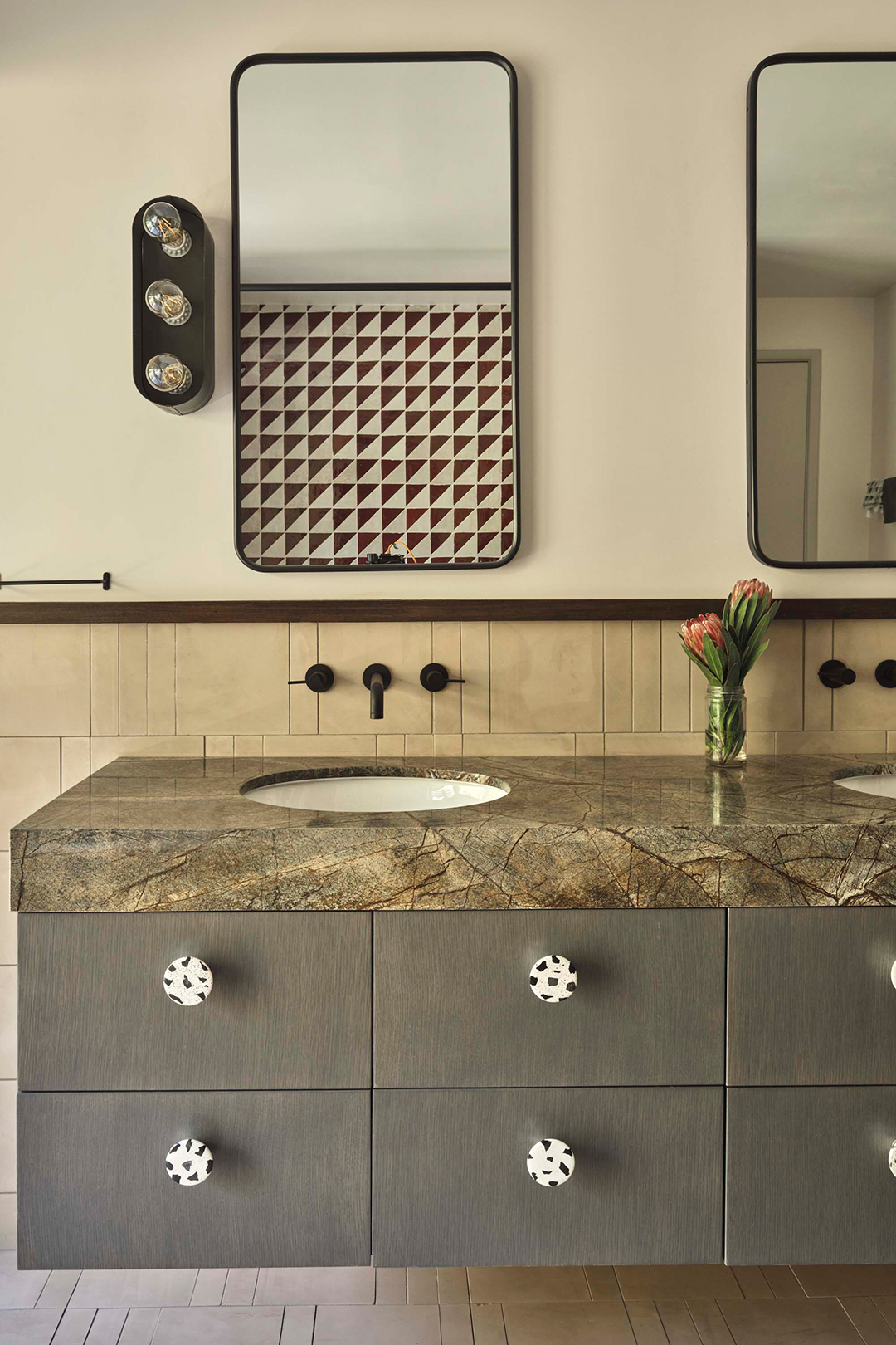 Like layering a colorful outfit, Gillespie knew that not every detail in the boys’ bathroom could be the star. “There is a graphic element in pretty much every surface, but it’s about finding that mixture where you’re still able to see certain focal points,” she says. Gillespie honed in on the shower. The interior walls are covered in a triangular pattern (a combination of two Zia Tile hues: Rouge and Casablanca), while solid amber zellige tiles encompass the facade. “You have to figure out which materials are going to help it shine but also have their own points of interest,” she adds.