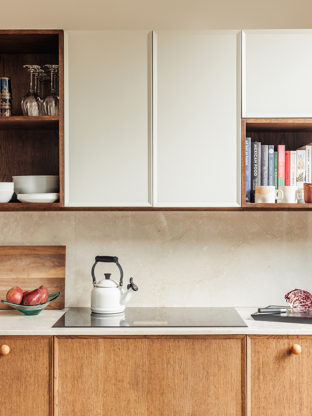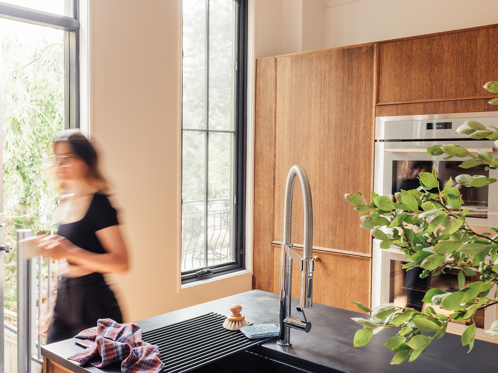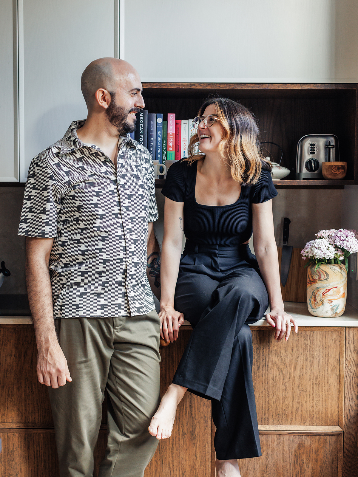 Building out the kitchen was a true test in patience. Luckily O’Leary has a good understanding of lead times, so she had ordered their Reform cabinets from the Danish brand back in November 2020 before the reno began. The boxes arrived around March of the following year and were finally installed in the summertime. The sleek push-to-open doors and drawers and dark walnut veneer fronts were certainly worth the wait, but it doesn’t help when your range and refrigerator also take an eternity to come. The new Thermador appliances the couple ordered the previous fall didn’t arrive until June 2021, and the vent hood was missing from the order altogether. “There was a moment of panic where we thought we’d have to wait another eight months for one piece, but it turned out to be easy to replace,” says Bossy.