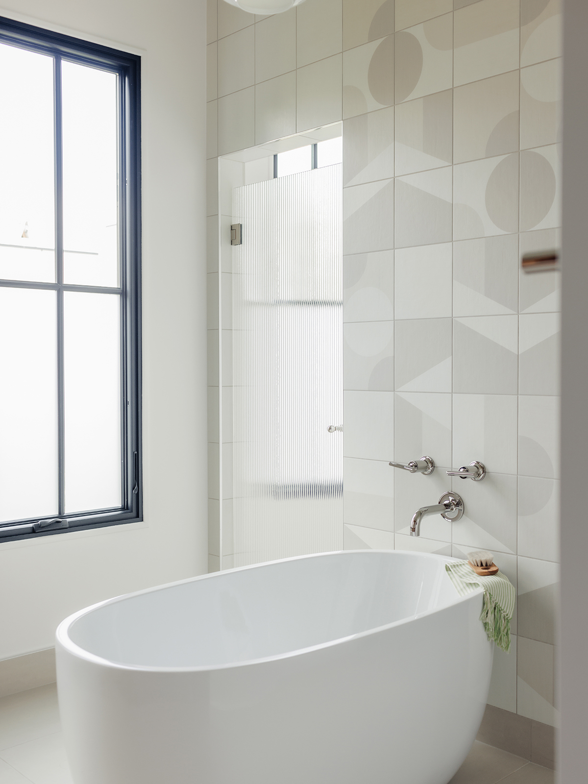 While salvaging was a big theme of their renovation, O’Leary welcomes change where it makes sense. “I’m not a traditionalist in the sense that I will keep everything, but I will preserve as much as I can and then do things in new and interesting ways,” she says. In the entryway, she wasn’t afraid to paint the woodwork glossy black and put down fresh graphic tile from Barber & Osgerby. (Psst: It’s the same pattern as the tub wall, just a different colorway.)