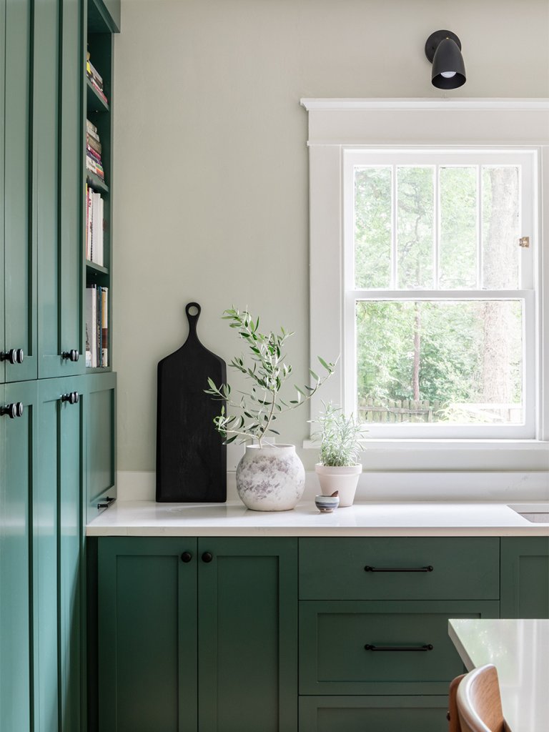 Asked if she would have done anything differently, Bendewald points to the circular door pulls on the cabinet. “They look better than they feel,” she confesses. “Given the weight of the stone, the roundness doesn’t allow for a firm finger grip, so if I could go back, I’d probably choose a different shape.” The storage may be a secret, but what’s not is Talbot and King’s love of it. “It’s our favorite kitchen feature of all,” says Talbot. The couple, who loves to entertain, enjoys showing it off to friends during get-togethers. “It’s like finding hidden treasure each time,” adds King.
