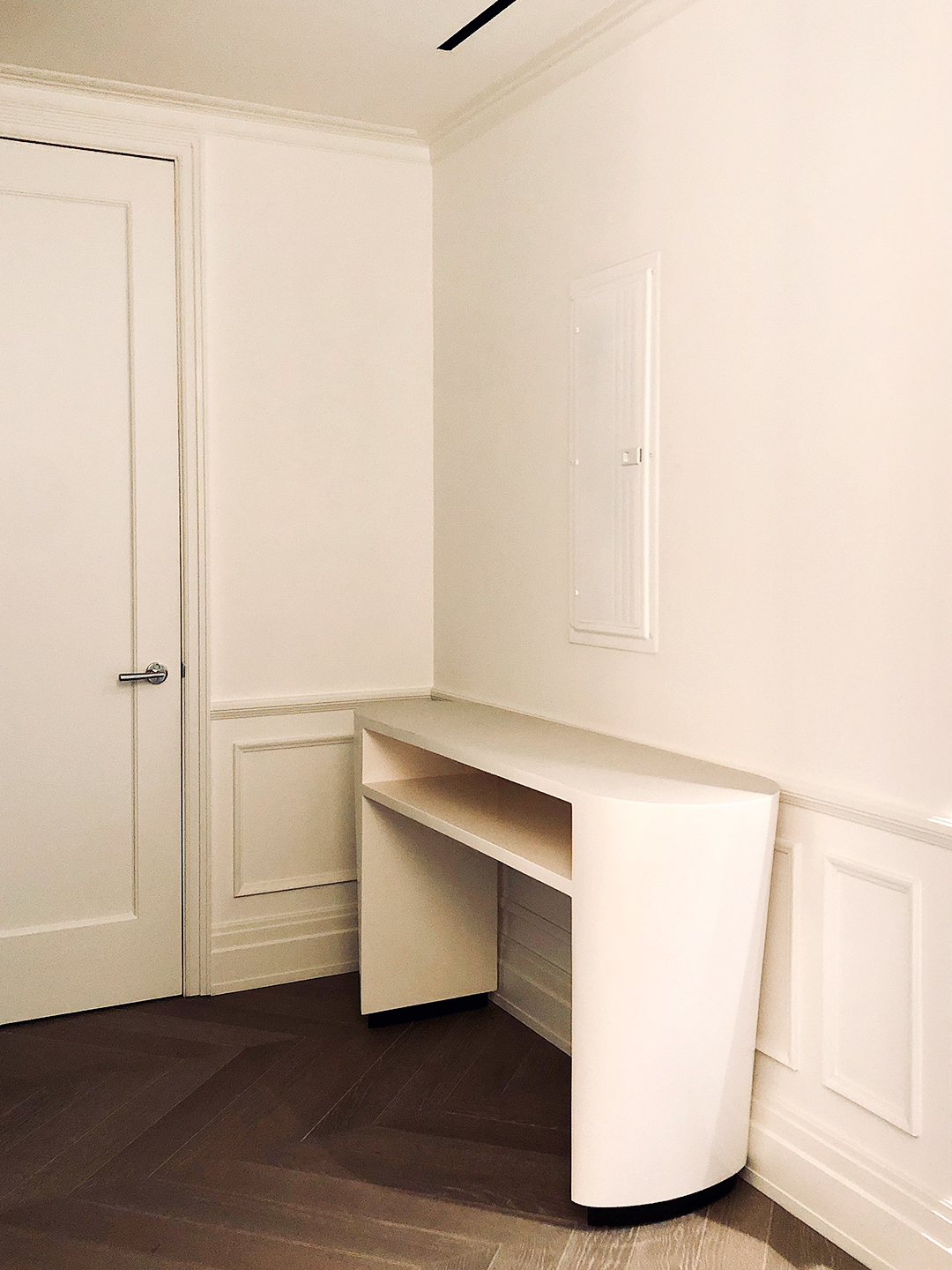 In a small New York City entryway, Capuano upgraded a standard wall mirror from Rejuvenation with a piano hinge (it’s long enough that only one is needed to handle the weight) in order to hide the fuses without rendering them inaccessible. “The box was the first thing you saw entering the apartment,” Capuano explains. For the mirror to appear flush against the wall (utility covers are often raised), Capuano worked with a millworker to place a slightly smaller arched wood panel that frames the electrical box. “The panel is secured at six anchor points, but for rentals I recommend using furniture pad stickers or a thin piece of MDF,” she says.