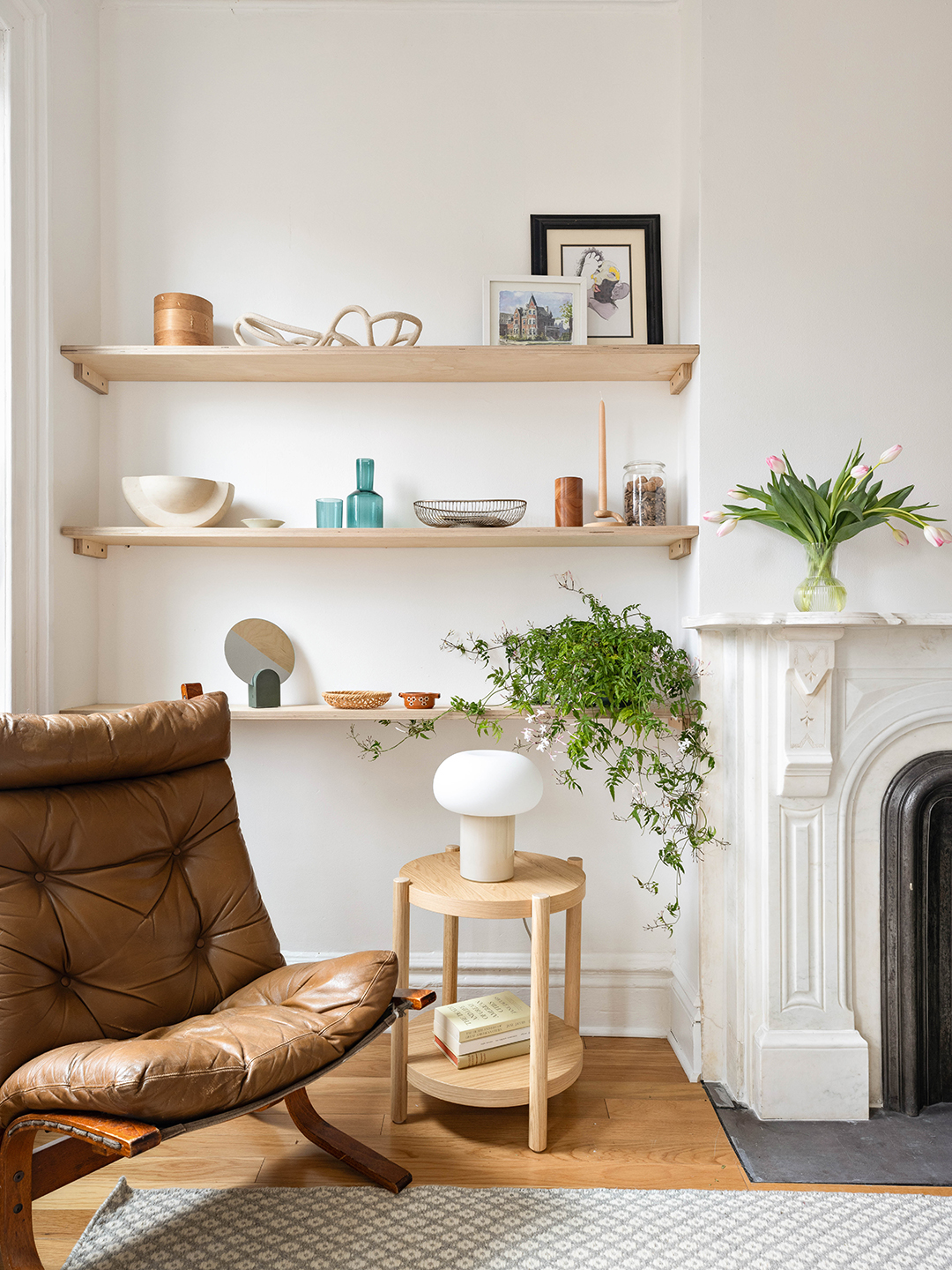 We took inspiration from other brownstone kids’ rooms and put the toddler bed to the right of the mantel, hung his mobile and some art above it, and got a full-size area rug that’s this really springy cotton that’s good for playrooms. This room can be a lot of things: You can fit a queen-size bed in here, you can turn the small alcove on the other side of the room into an exercise area or a sectioned-off bedroom for another kid. We are always down for flexibility.