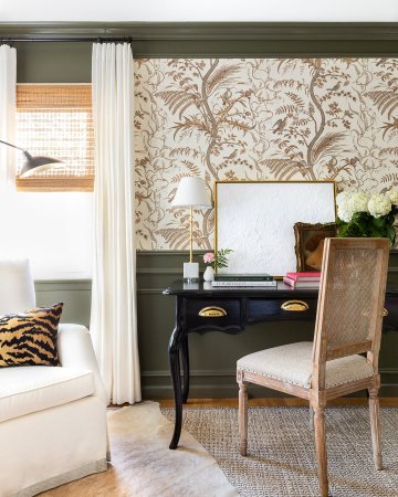 By sewing two velvet Sanela panels together, and adding an extra-wide trim from Etsy to create more drama, designer Maggie Overby created custom-looking window covers that exude elegance. For the wall-to-wall effect, she mounted the fabric with ceiling tracks from Amazon.
