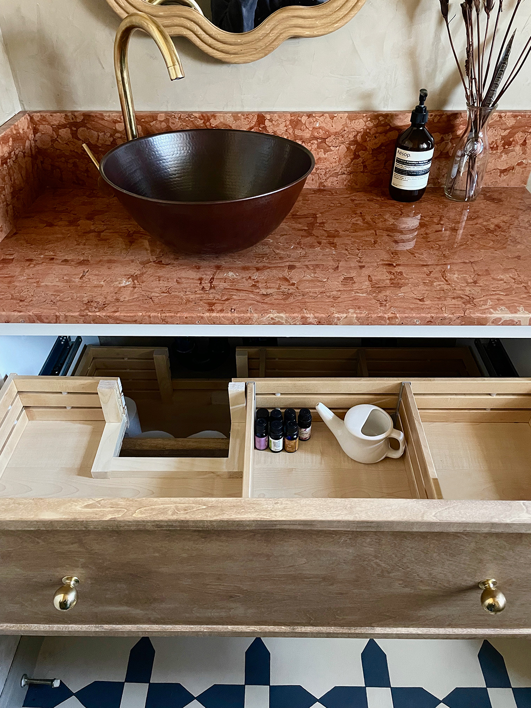 A local stone yard in western Massachusetts had three full slabs of this red travertine, and they told me they’d had it for nearly 15 years. Nobody wanted to buy it! The slabs were three-quarter-inch—the perfect thickness for my vanity. It was a total score.
